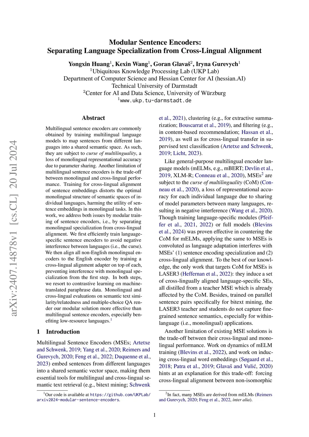 Modular Sentence Encoders: Separating Language Specialization from Cross-Lingual Alignment