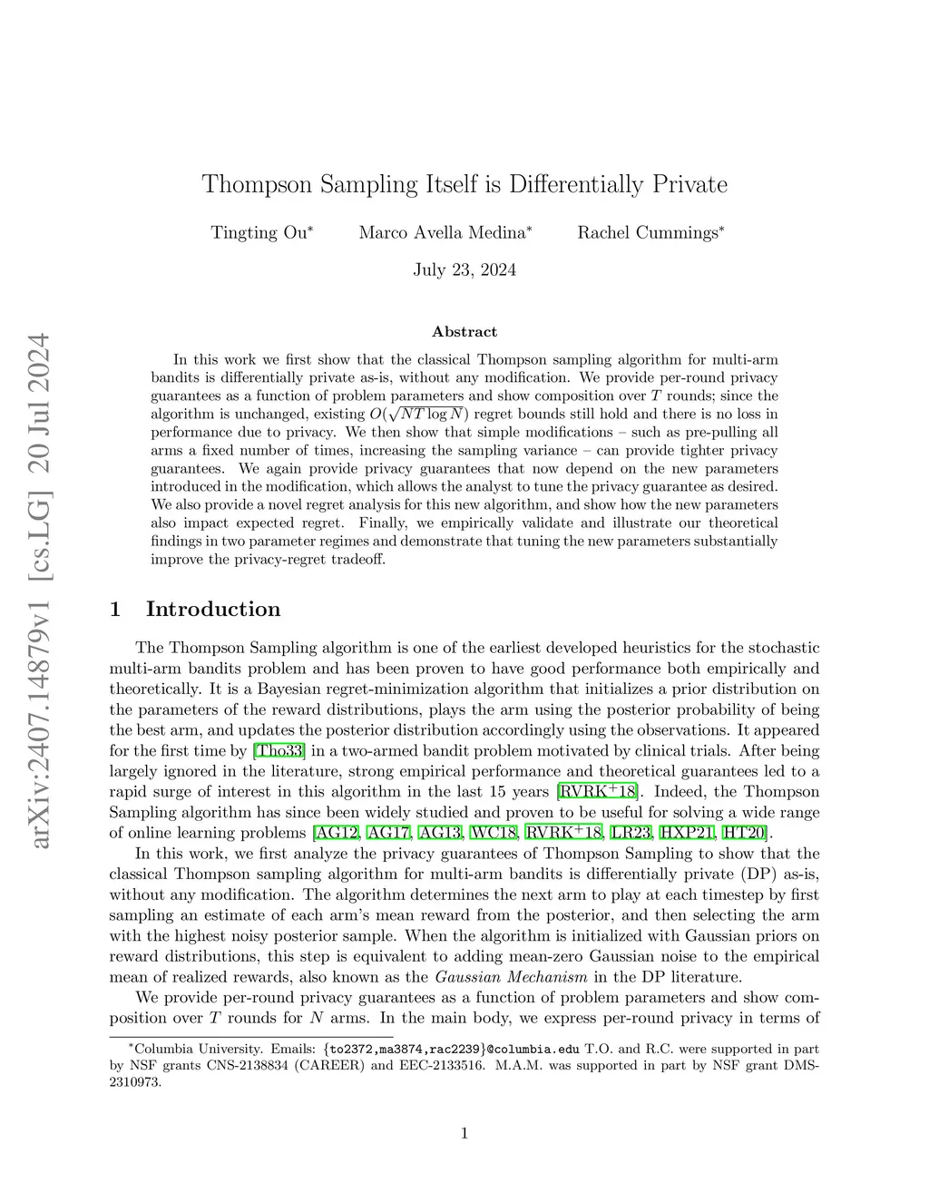 In this work we first show that the classical Thompson sampling algorithm for multi-arm bandits is differentially private as-is, without any modification. We provide per-round privacy guarantees as a function of problem parameters and show composition over rounds; since the algorithm is unchanged, existing regret bounds still hold and there is no loss in performance due to privacy. We then show that simple modifications -- such as pre-pulling all arms a fixed number of times, increasing the sampling variance -- can provide tighter privacy guarantees. We again provide privacy guarantees that now depend on the new parameters introduced in the modification, which allows the analyst to tune the privacy guarantee as desired. We also provide a novel regret analysis for this new algorithm, and show how the new parameters also impact expected regret. Finally, we empirically validate and illustrate our theoretical findings in two parameter regimes and demonstrate that tuning the new parameters substantially improve the privacy-regret tradeoff.