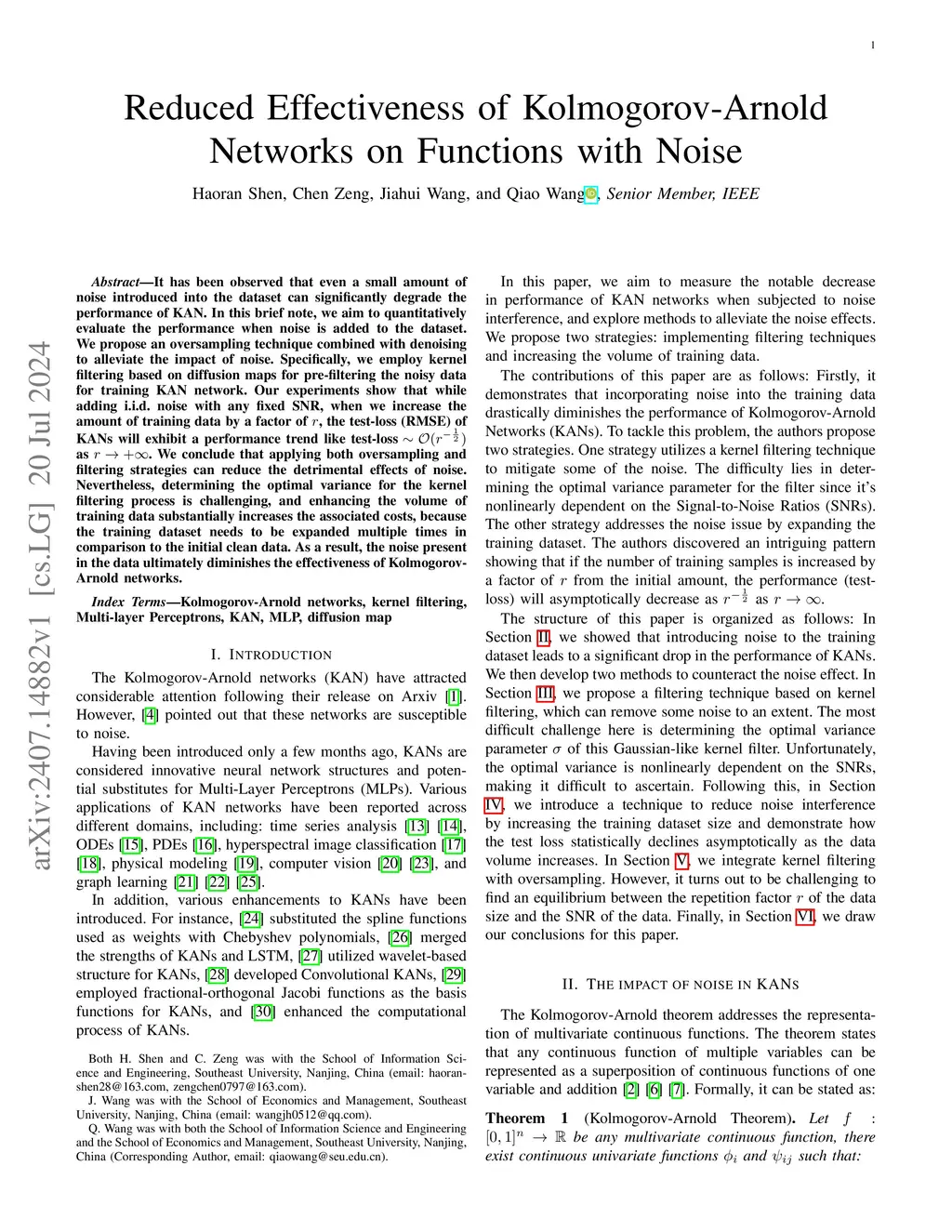 It has been observed that even a small amount of noise introduced into the dataset can significantly degrade the performance of KAN. In this brief note, we aim to quantitatively evaluate the performance when noise is added to the dataset. We propose an oversampling technique combined with denoising to alleviate the impact of noise. Specifically, we employ kernel filtering based on diffusion maps for pre-filtering the noisy data for training KAN network. Our experiments show that while adding i.i.d. noise with any fixed SNR, when we increase the amount of training data by a factor of , the test-loss (RMSE) of KANs will exhibit a performance trend like as . We conclude that applying both oversampling and filtering strategies can reduce the detrimental effects of noise. Nevertheless, determining the optimal variance for the kernel filtering process is challenging, and enhancing the volume of training data substantially increases the associated costs, because the training dataset needs to be expanded multiple times in comparison to the initial clean data. As a result, the noise present in the data ultimately diminishes the effectiveness of Kolmogorov-Arnold networks.