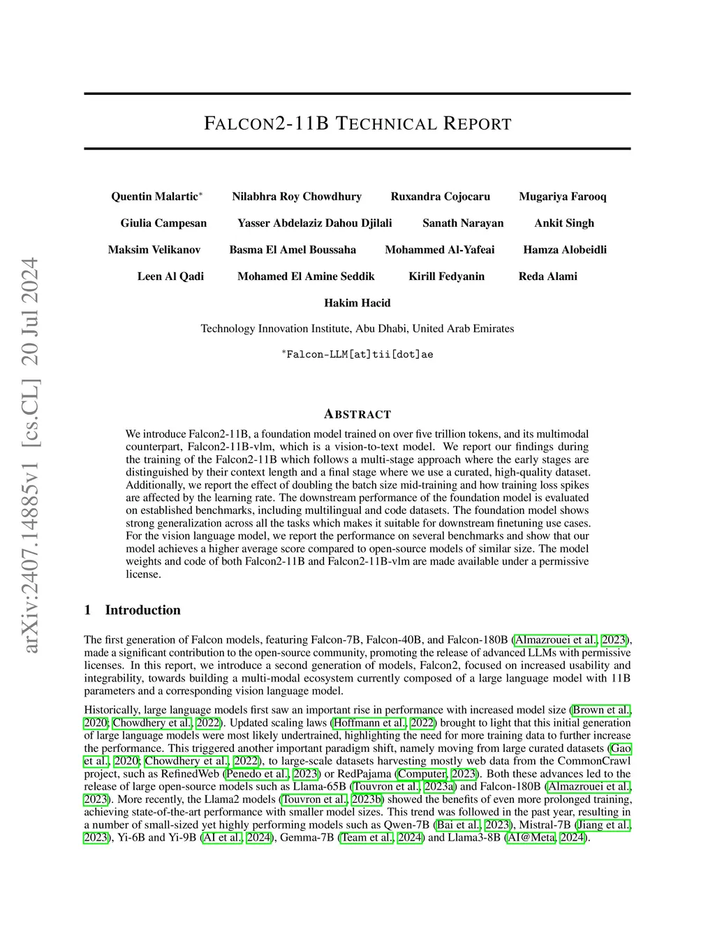 We introduce Falcon2-11B, a foundation model trained on over five trillion tokens, and its multimodal counterpart, Falcon2-11B-vlm, which is a vision-to-text model. We report our findings during the training of the Falcon2-11B which follows a multi-stage approach where the early stages are distinguished by their context length and a final stage where we use a curated, high-quality dataset. Additionally, we report the effect of doubling the batch size mid-training and how training loss spikes are affected by the learning rate. The downstream performance of the foundation model is evaluated on established benchmarks, including multilingual and code datasets. The foundation model shows strong generalization across all the tasks which makes it suitable for downstream finetuning use cases. For the vision language model, we report the performance on several benchmarks and show that our model achieves a higher average score compared to open-source models of similar size. The model weights and code of both Falcon2-11B and Falcon2-11B-vlm are made available under a permissive license.