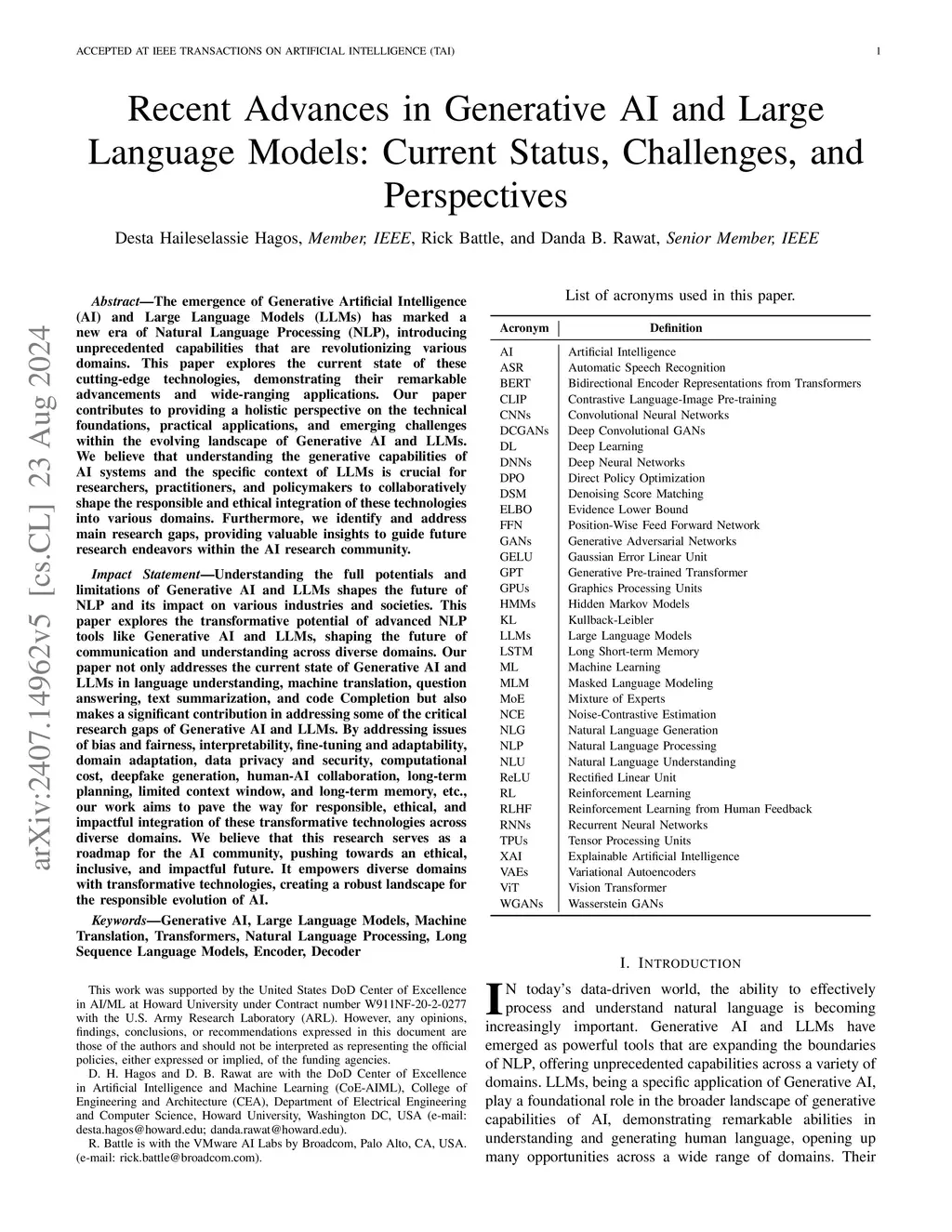 Recent Advances in Generative AI and Large Language Models: Current