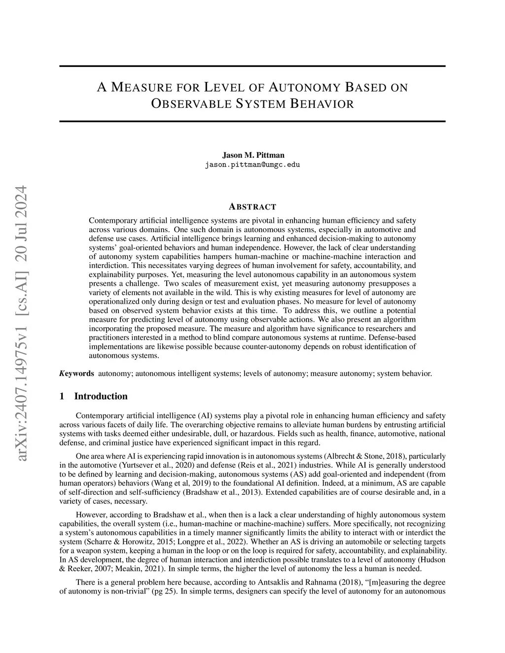 Contemporary artificial intelligence systems are pivotal in enhancing human efficiency and safety across various domains. One such domain is autonomous systems, especially in automotive and defense use cases. Artificial intelligence brings learning and enhanced decision-making to autonomy system goal-oriented behaviors and human independence. However, the lack of clear understanding of autonomy system capabilities hampers human-machine or machine-machine interaction and interdiction. This necessitates varying degrees of human involvement for safety, accountability, and explainability purposes. Yet, measuring the level autonomous capability in an autonomous system presents a challenge. Two scales of measurement exist, yet measuring autonomy presupposes a variety of elements not available in the wild. This is why existing measures for level of autonomy are operationalized only during design or test and evaluation phases. No measure for level of autonomy based on observed system behavior exists at this time. To address this, we outline a potential measure for predicting level of autonomy using observable actions. We also present an algorithm incorporating the proposed measure. The measure and algorithm have significance to researchers and practitioners interested in a method to blind compare autonomous systems at runtime. Defense-based implementations are likewise possible because counter-autonomy depends on robust identification of autonomous systems.