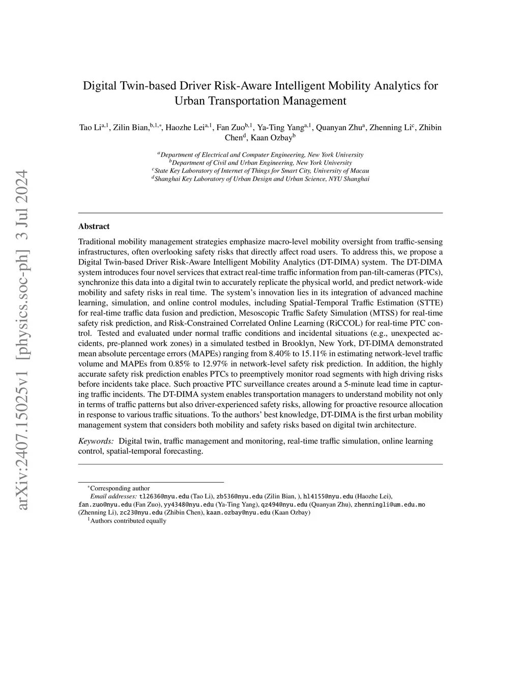 Traditional mobility management strategies emphasize macro-level mobility oversight from traffic-sensing infrastructures, often overlooking safety risks that directly affect road users. To address this, we propose a Digital Twin-based Driver Risk-Aware Intelligent Mobility Analytics (DT-DIMA) system. The DT-DIMA system integrates real-time traffic information from pan-tilt-cameras (PTCs), synchronizes this data into a digital twin to accurately replicate the physical world, and predicts network-wide mobility and safety risks in real time. The system's innovation lies in its integration of spatial-temporal modeling, simulation, and online control modules. Tested and evaluated under normal traffic conditions and incidental situations (e.g., unexpected accidents, pre-planned work zones) in a simulated testbed in Brooklyn, New York, DT-DIMA demonstrated mean absolute percentage errors (MAPEs) ranging from 8.40% to 15.11% in estimating network-level traffic volume and MAPEs from 0.85% to 12.97% in network-level safety risk prediction. In addition, the highly accurate safety risk prediction enables PTCs to preemptively monitor road segments with high driving risks before incidents take place. Such proactive PTC surveillance creates around a 5-minute lead time in capturing traffic incidents. The DT-DIMA system enables transportation managers to understand mobility not only in terms of traffic patterns but also driver-experienced safety risks, allowing for proactive resource allocation in response to various traffic situations. To the authors' best knowledge, DT-DIMA is the first urban mobility management system that considers both mobility and safety risks based on digital twin architecture.
