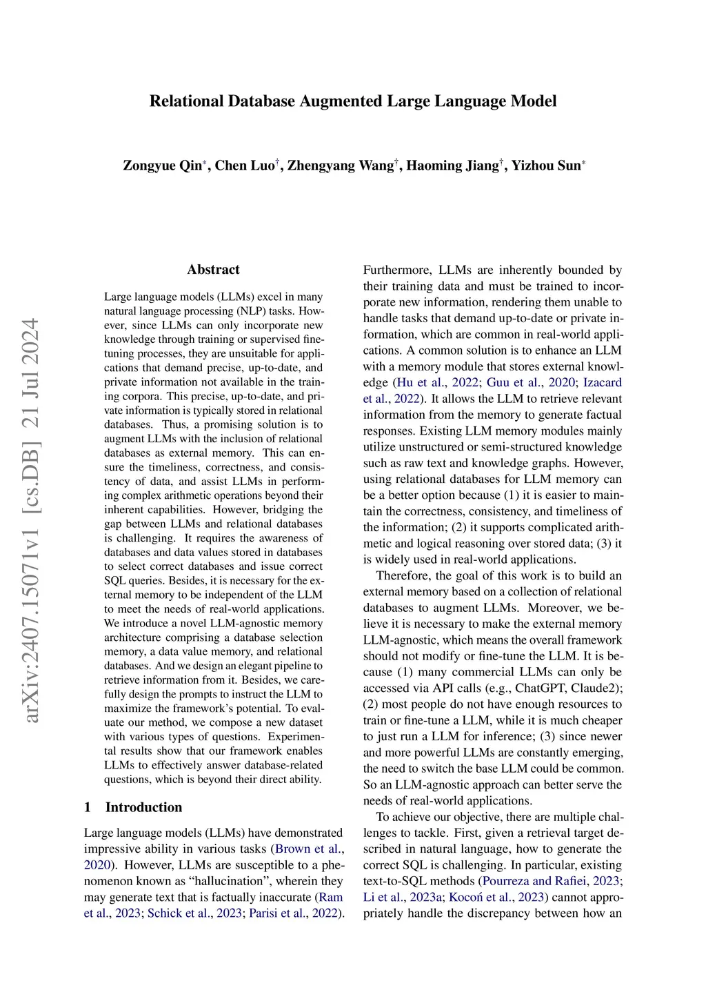Large language models (LLMs) excel in many natural language processing (NLP) tasks. However, since LLMs can only incorporate new knowledge through training or supervised fine-tuning processes, they are unsuitable for applications that demand precise, up-to-date, and private information not available in the training corpora. This precise, up-to-date, and private information is typically stored in relational databases. Thus, a promising solution is to augment LLMs with the inclusion of relational databases as external memory. This can ensure the timeliness, correctness, and consistency of data, and assist LLMs in performing complex arithmetic operations beyond their inherent capabilities. However, bridging the gap between LLMs and relational databases is challenging. It requires the awareness of databases and data values stored in databases to select correct databases and issue correct SQL queries. Besides, it is necessary for the external memory to be independent of the LLM to meet the needs of real-world applications. We introduce a novel LLM-agnostic memory architecture comprising a database selection memory, a data value memory, and relational databases. And we design an elegant pipeline to retrieve information from it. Besides, we carefully design the prompts to instruct the LLM to maximize the framework's potential. To evaluate our method, we compose a new dataset with various types of questions. Experimental results show that our framework enables LLMs to effectively answer database-related questions, which is beyond their direct ability.