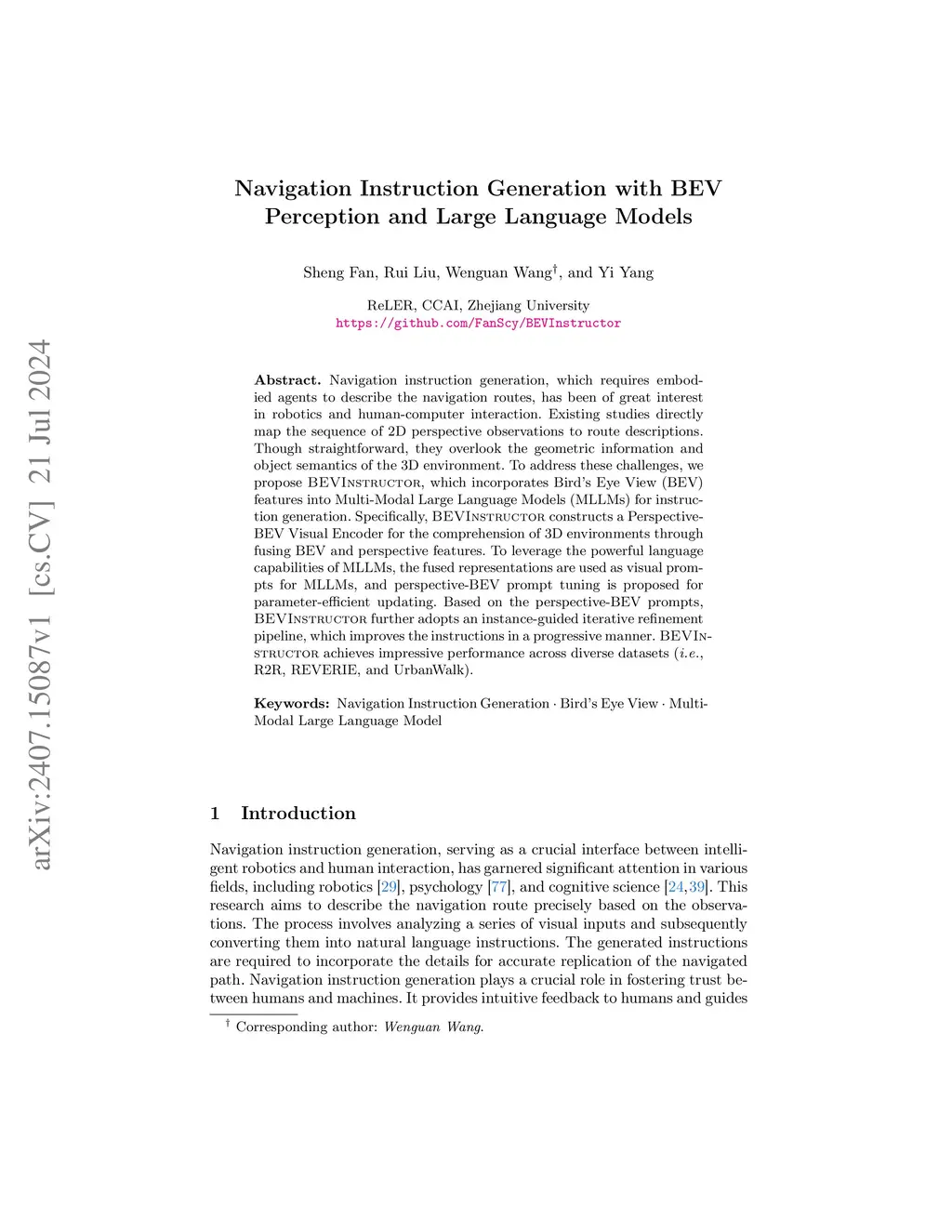 Navigation instruction generation, which requires embodied agents to describe the navigation routes, has been of great interest in robotics and human-computer interaction. Existing studies directly map the sequence of 2D perspective observations to route descriptions. Though straightforward, they overlook the geometric information and object semantics of the 3D environment. To address these challenges, we propose BEVInstructor, which incorporates Bird's Eye View (BEV) features into Multi-Modal Large Language Models (MLLMs) for instruction generation. Specifically, BEVInstructor constructs a PerspectiveBEVVisual Encoder for the comprehension of 3D environments through fusing BEV and perspective features. To leverage the powerful language capabilities of MLLMs, the fused representations are used as visual prompts for MLLMs, and perspective-BEV prompt tuning is proposed for parameter-efficient updating. Based on the perspective-BEV prompts, BEVInstructor further adopts an instance-guided iterative refinement pipeline, which improves the instructions in a progressive manner. BEVInstructor achieves impressive performance across diverse datasets (i.e., R2R, REVERIE, and UrbanWalk).