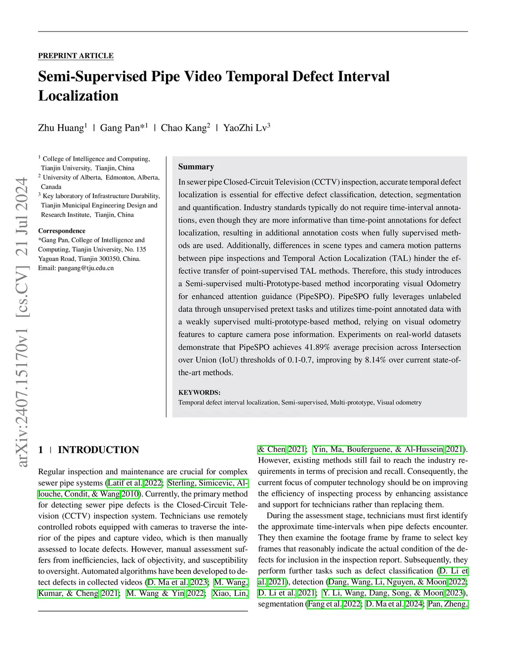 In sewer pipe Closed-Circuit Television (CCTV) inspection, accurate temporal defect localization is essential for effective defect classification, detection, segmentation and quantification. Industry standards typically do not require time-interval annotations, even though they are more informative than time-point annotations for defect localization, resulting in additional annotation costs when fully supervised methods are used. Additionally, differences in scene types and camera motion patterns between pipe inspections and Temporal Action Localization (TAL) hinder the effective transfer of point-supervised TAL methods. Therefore, this study introduces a Semi-supervised multi-Prototype-based method incorporating visual Odometry for enhanced attention guidance (PipeSPO). PipeSPO fully leverages unlabeled data through unsupervised pretext tasks and utilizes time-point annotated data with a weakly supervised multi-prototype-based method, relying on visual odometry features to capture camera pose information. Experiments on real-world datasets demonstrate that PipeSPO achieves 41.89% average precision across Intersection over Union (IoU) thresholds of 0.1-0.7, improving by 8.14% over current state-of-the-art methods.