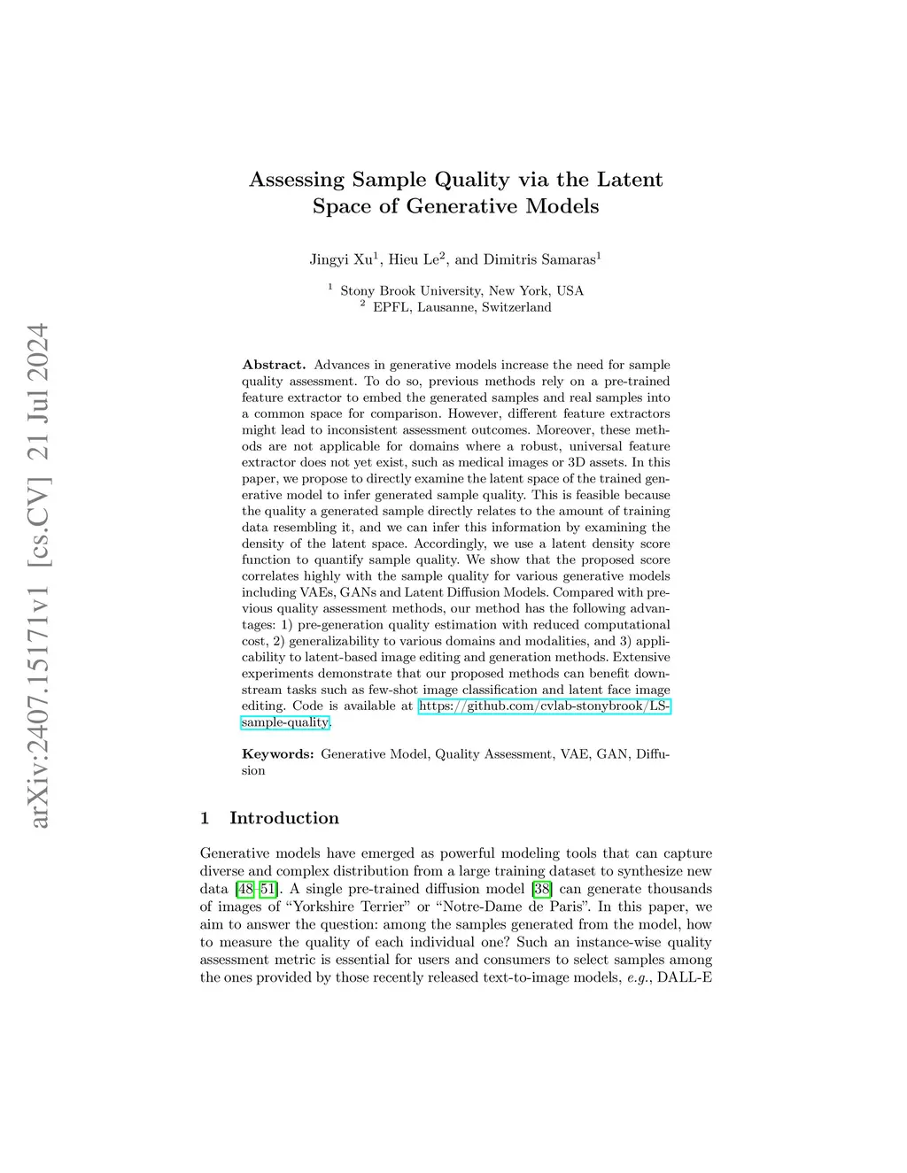 Assessing Sample Quality via the Latent Space of Generative Models