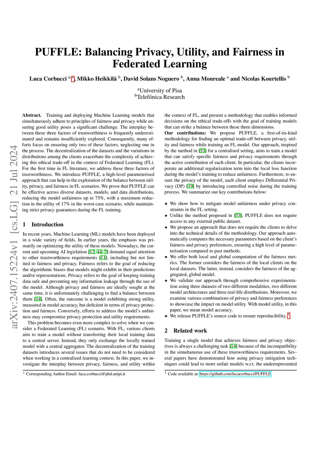 Training and deploying Machine Learning models that simultaneously adhere to principles of fairness and privacy while ensuring good utility poses a significant challenge. The interplay between these three factors of trustworthiness is frequently underestimated and remains insufficiently explored. Consequently, many efforts focus on ensuring only two of these factors, neglecting one in the process. The decentralization of the datasets and the variations in distributions among the clients exacerbate the complexity of achieving this ethical trade-off in the context of Federated Learning (FL). For the first time in FL literature, we address these three factors of trustworthiness. We introduce PUFFLE, a high-level parameterised approach that can help in the exploration of the balance between utility, privacy, and fairness in FL scenarios. We prove that PUFFLE can be effective across diverse datasets, models, and data distributions, reducing the model unfairness up to 75%, with a maximum reduction in the utility of 17% in the worst-case scenario, while maintaining strict privacy guarantees during the FL training.