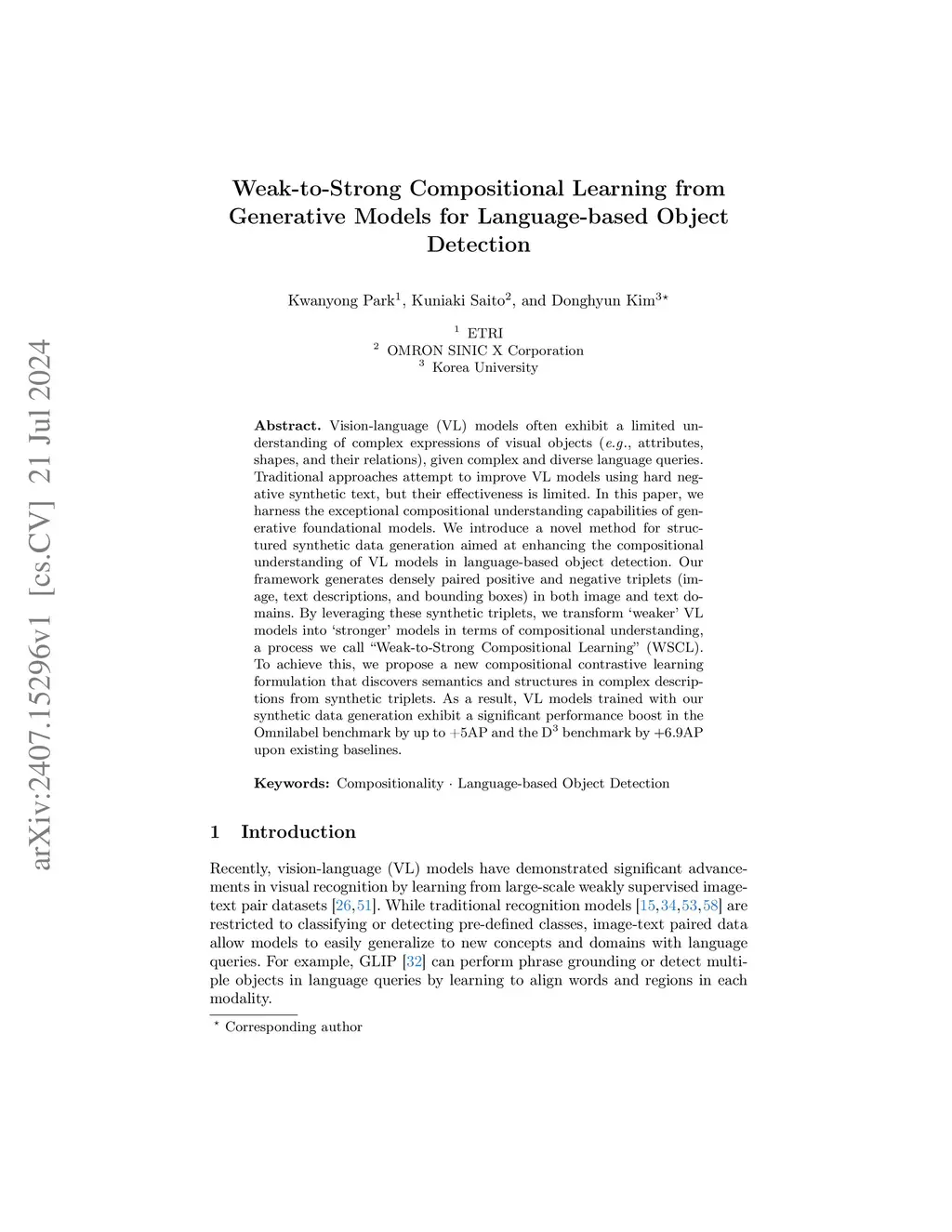 Vision-language (VL) models often exhibit a limited understanding of complex expressions of visual objects (e.g., attributes, shapes, and their relations), given complex and diverse language queries. Traditional approaches attempt to improve VL models using hard negative synthetic text, but their effectiveness is limited. In this paper, we harness the exceptional compositional understanding capabilities of generative foundational models. We introduce a novel method for structured synthetic data generation aimed at enhancing the compositional understanding of VL models in language-based object detection. Our framework generates densely paired positive and negative triplets (image, text descriptions, and bounding boxes) in both image and text domains. By leveraging these synthetic triplets, we transform 'weaker' VL models into 'stronger' models in terms of compositional understanding, a process we call "Weak-to-Strong Compositional Learning" (WSCL). To achieve this, we propose a new compositional contrastive learning formulation that discovers semantics and structures in complex descriptions from synthetic triplets. As a result, VL models trained with our synthetic data generation exhibit a significant performance boost in the Omnilabel benchmark by up to +5AP and the D3 benchmark by +6.9AP upon existing baselines.
