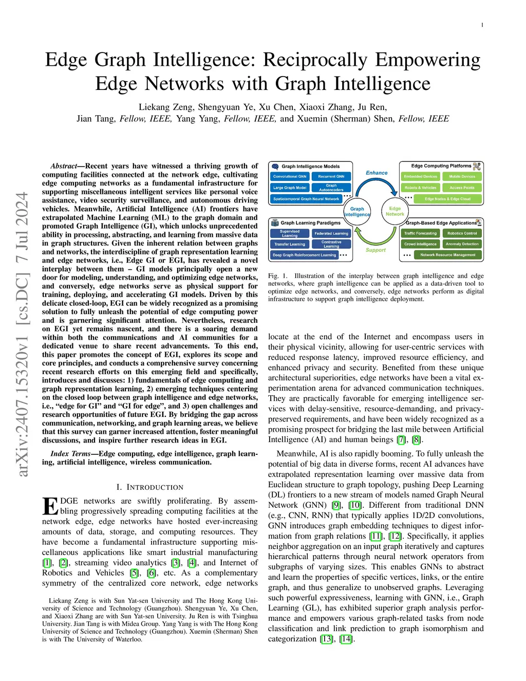 Recent years have witnessed a thriving growth of computing facilities connected at the network edge, cultivating edge networks as a fundamental infrastructure for supporting miscellaneous intelligentthis http URL, Artificial Intelligence (AI) frontiers have extrapolated to the graph domain and promoted Graph Intelligence (GI). Given the inherent relation between graphs and networks, the interdiscipline of graph learning and edge networks, i.e., Edge GI or EGI, has revealed a novel interplay between them -- GI aids in optimizing edge networks, while edge networks facilitate GI model deployment. Driven by this delicate closed-loop, EGI is recognized as a promising solution to fully unleash the potential of edge computing power and is garnering growing attention. Nevertheless, research on EGI remains nascent, and there is a soaring demand within both the communications and AI communities for a dedicated venue to share recent advancements. To this end, this paper promotes the concept of EGI, explores its scope and core principles, and conducts a comprehensive survey concerning recent research efforts on this emerging field. Specifically, this paper introduces and discusses: 1) fundamentals of edge computing and graph learning,2) emerging techniques centering on the closed loop between graph intelligence and edge networks, and 3) open challenges and research opportunities of future EGI. By bridging the gap across communication, networking, and graph learning areas, we believe that this survey can garner increased attention, foster meaningful discussions, and inspire further research ideas in EGI.