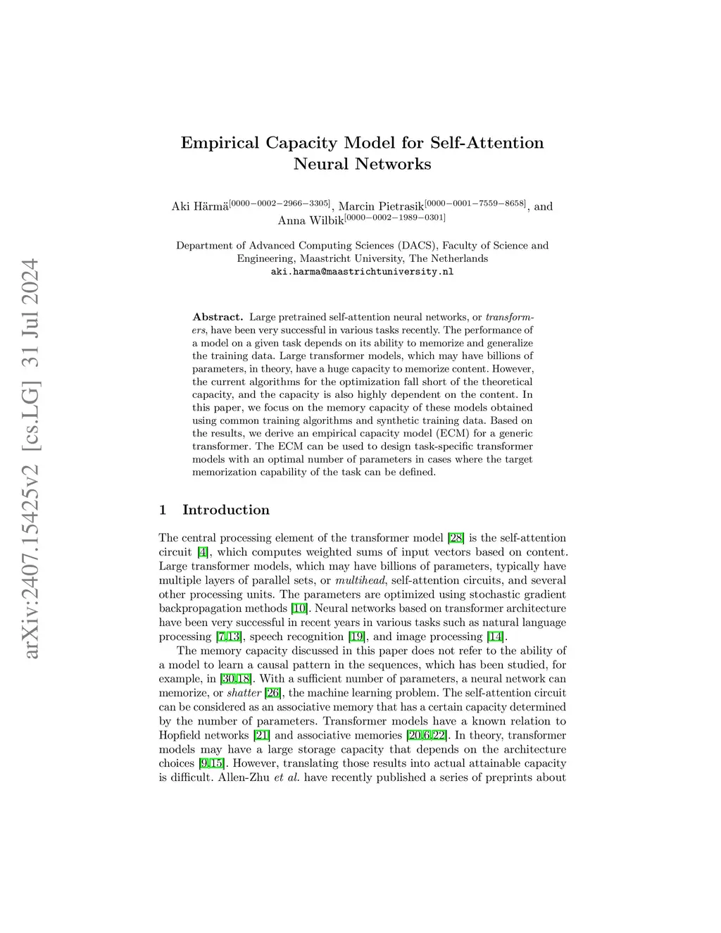 Large pretrained self-attention neural networks, or transformers, have been very successful in various tasks recently. The performance of a model on a given task depends on its ability to memorize and generalize the training data. Large transformer models, which may have billions of parameters, in theory have a huge capacity to memorize content. However, the current algorithms for the optimization fall short of the theoretical capacity, and the capacity is also highly dependent on the content. In this paper, we focus on the memory capacity of these models obtained using common training algorithms and synthetic training data. Based on the results, we derive an empirical capacity model (ECM) for a generic transformer. The ECM can be used to design task-specific transformer models with an optimal number of parameters in cases where the target memorization capability of the task can be defined.