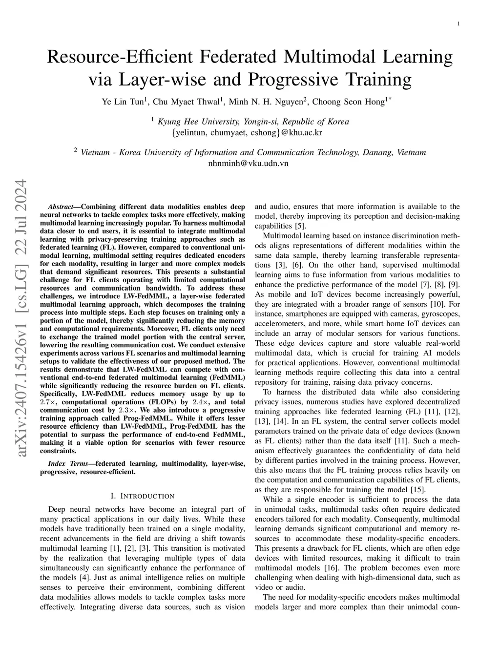Combining different data modalities enables deep neural networks to tackle complex tasks more effectively, making multimodal learning increasingly popular. To harness multimodal data closer to end users, it is essential to integrate multimodal learning with privacy-preserving training approaches such as federated learning (FL). However, compared to conventional unimodal learning, multimodal setting requires dedicated encoders for each modality, resulting in larger and more complex models that demand significant resources. This presents a substantial challenge for FL clients operating with limited computational resources and communication bandwidth. To address these challenges, we introduce LW-FedMML, a layer-wise federated multimodal learning approach, which decomposes the training process into multiple steps. Each step focuses on training only a portion of the model, thereby significantly reducing the memory and computational requirements. Moreover, FL clients only need to exchange the trained model portion with the central server, lowering the resulting communication cost. We conduct extensive experiments across various FL scenarios and multimodal learning setups to validate the effectiveness of our proposed method. The results demonstrate that LW-FedMML can compete with conventional end-to-end federated multimodal learning (FedMML) while significantly reducing the resource burden on FL clients. Specifically, LW-FedMML reduces memory usage by up to , computational operations (FLOPs) by , and total communication cost by . We also introduce a progressive training approach called Prog-FedMML. While it offers lesser resource efficiency than LW-FedMML, Prog-FedMML has the potential to surpass the performance of end-to-end FedMML, making it a viable option for scenarios with fewer resource constraints.