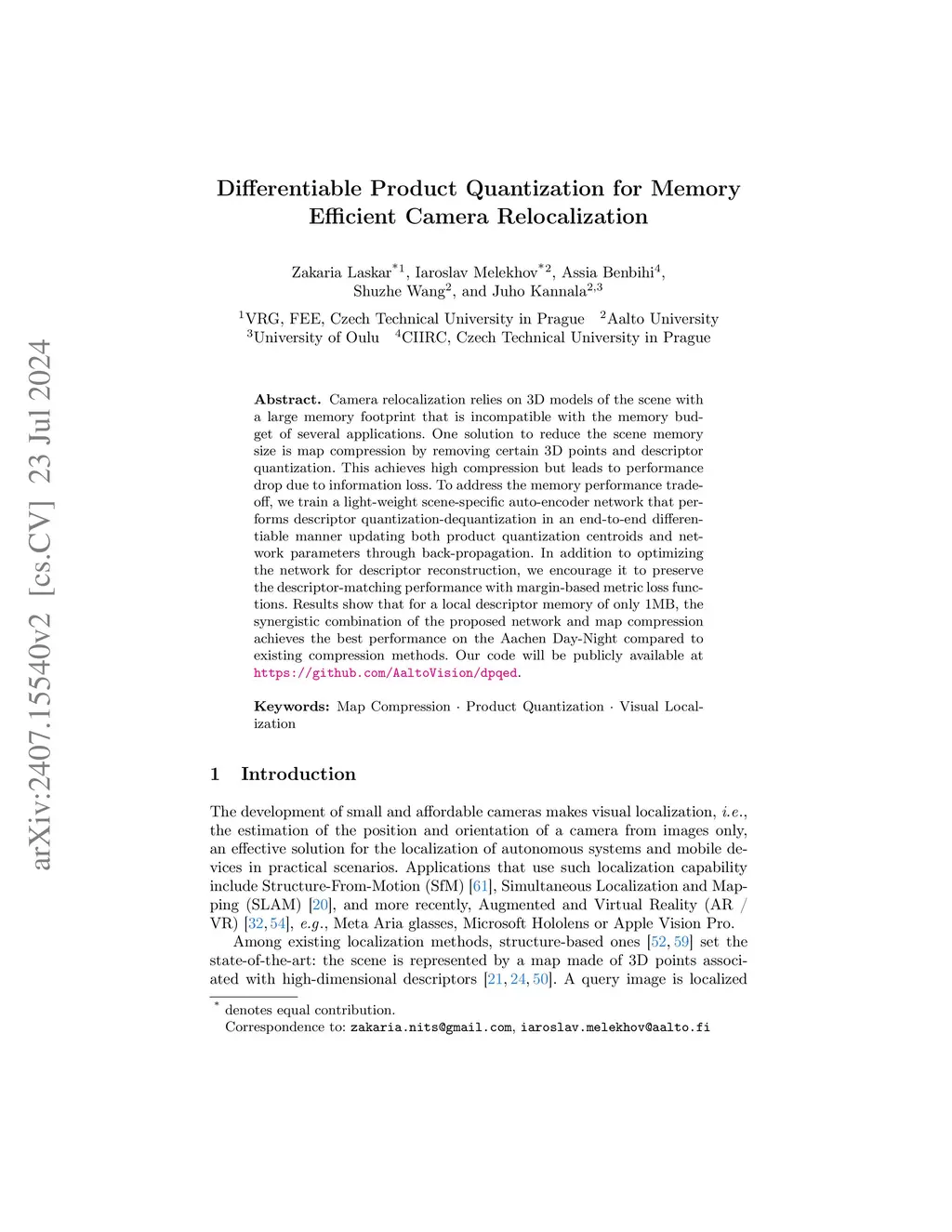 Differentiable Product Quantization for Memory Efficient Camera Relocalization