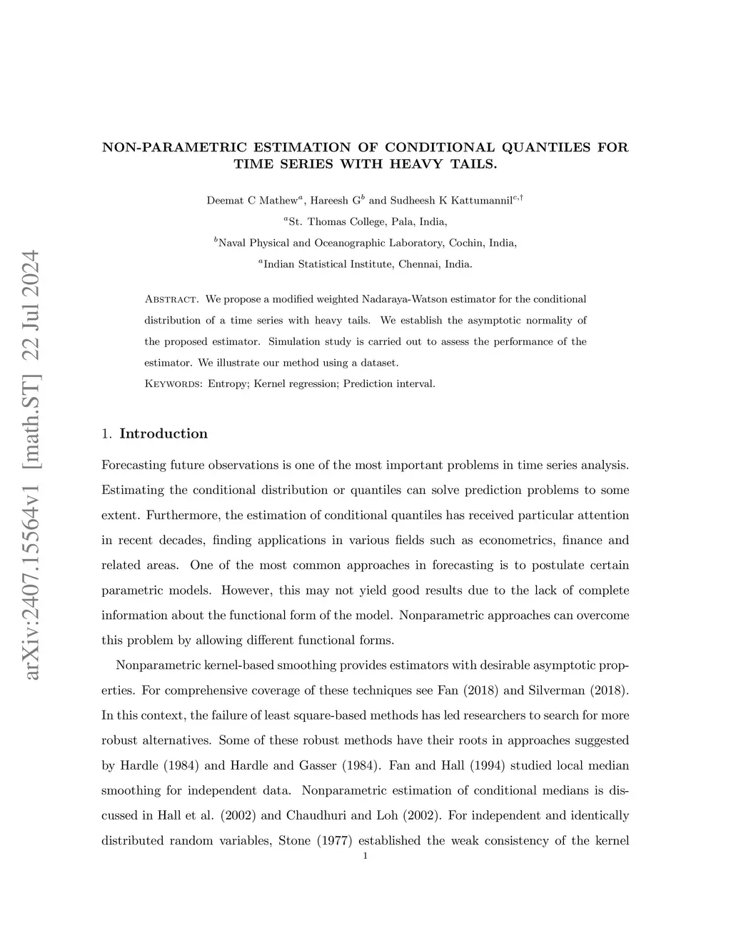We propose a modified weighted Nadaraya-Watson estimator for the conditional distribution of a time series with heavy tails. We establish the asymptotic normality of the proposed estimator. Simulation study is carried out to assess the performance of the estimator. We illustrate our method using a dataset.