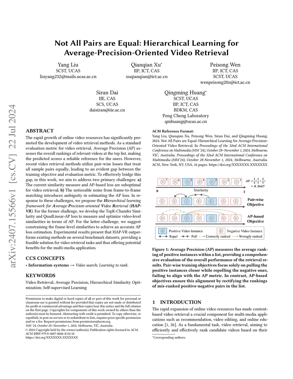 The rapid growth of online video resources has significantly promoted the development of video retrieval methods. As a standard evaluation metric for video retrieval, Average Precision (AP) assesses the overall rankings of relevant videos at the top list, making the predicted scores a reliable reference for users. However, recent video retrieval methods utilize pair-wise losses that treat all sample pairs equally, leading to an evident gap between the training objective and evaluation metric. To effectively bridge this gap, in this work, we aim to address two primary challenges: a) The current similarity measure and AP-based loss are suboptimal for video retrieval; b) The noticeable noise from frame-to-frame matching introduces ambiguity in estimating the AP loss. In response to these challenges, we propose the Hierarchical learning framework for Average-Precision-oriented Video Retrieval (HAP-VR). For the former challenge, we develop the TopK-Chamfer Similarity and QuadLinear-AP loss to measure and optimize video-level similarities in terms of AP. For the latter challenge, we suggest constraining the frame-level similarities to achieve an accurate AP loss estimation. Experimental results present that HAP-VR outperforms existing methods on several benchmark datasets, providing a feasible solution for video retrieval tasks and thus offering potential benefits for the multi-media application.