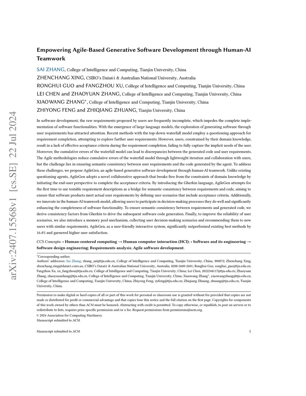 In software development, the raw requirements proposed by users are frequently incomplete, which impedes the complete implementation of application functionalities. With the emergence of large language models, recent methods with the top-down waterfall model employ a questioning approach for requirement completion, attempting to explore further user requirements. However, users, constrained by their domain knowledge, lack effective acceptance criteria, which fail to capture the implicit needs of the user. Moreover, the cumulative errors of the waterfall model can lead to discrepancies between the generated code and user requirements. The Agile methodologies reduce cumulative errors through lightweight iteration and collaboration with users, but the challenge lies in ensuring semantic consistency between user requirements and the code generated. We propose AgileGen, an agile-based generative software development through human-AI teamwork. AgileGen attempts for the first time to use testable requirements by Gherkin for semantic consistency between requirements and code. Additionally, we innovate in human-AI teamwork, allowing users to participate in decision-making processes they do well and enhancing the completeness of application functionality. Finally, to improve the reliability of user scenarios, a memory pool mechanism is used to collect user decision-making scenarios and recommend them to new users. AgileGen, as a user-friendly interactive system, significantly outperformed existing best methods by 16.4% and garnered higher user satisfaction.