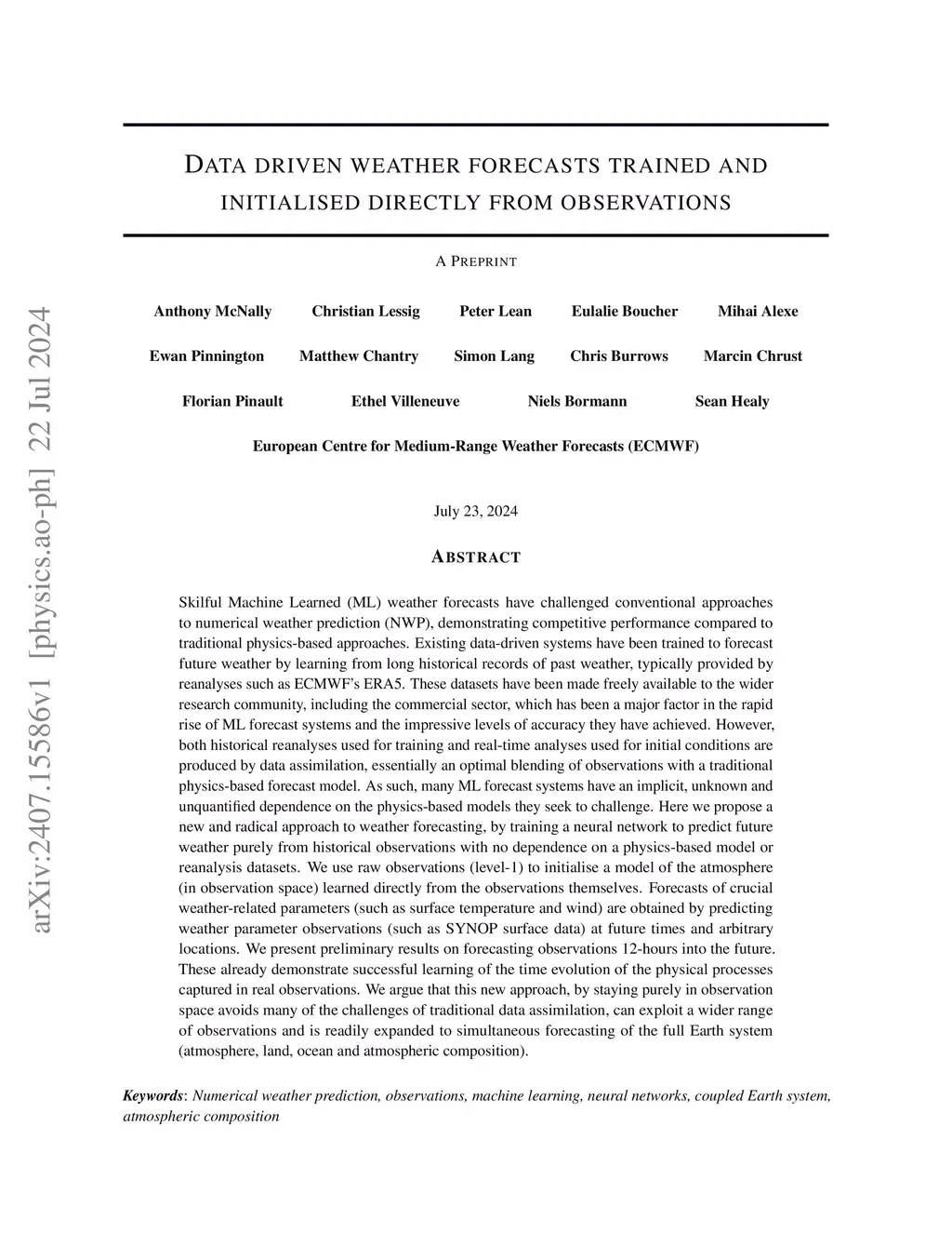 Skilful Machine Learned weather forecasts have challenged our approach to numerical weather prediction, demonstrating competitive performance compared to traditional physics-based approaches. Data-driven systems have been trained to forecast future weather by learning from long historical records of past weather such as the ECMWF ERA5. These datasets have been made freely available to the wider research community, including the commercial sector, which has been a major factor in the rapid rise of ML forecast systems and the levels of accuracy they have achieved. However, historical reanalyses used for training and real-time analyses used for initial conditions are produced by data assimilation, an optimal blending of observations with a physics-based forecast model. As such, many ML forecast systems have an implicit and unquantified dependence on the physics-based models they seek to challenge. Here we propose a new approach, training a neural network to predict future weather purely from historical observations with no dependence on reanalyses. We use raw observations to initialise a model of the atmosphere (in observation space) learned directly from the observations themselves. Forecasts of crucial weather parameters (such as surface temperature and wind) are obtained by predicting weather parameter observations (e.g. SYNOP surface data) at future times and arbitrary locations. We present preliminary results on forecasting observations 12-hours into the future. These already demonstrate successful learning of time evolutions of the physical processes captured in real observations. We argue that this new approach, by staying purely in observation space, avoids many of the challenges of traditional data assimilation, can exploit a wider range of observations and is readily expanded to simultaneous forecasting of the full Earth system (atmosphere, land, ocean and composition).