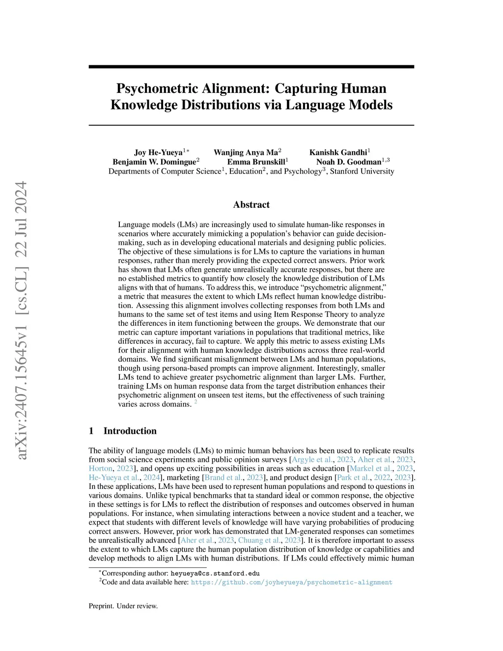 Language models (LMs) are increasingly used to simulate human-like responses in scenarios where accurately mimicking a population's behavior can guide decision-making, such as in developing educational materials and designing public policies. The objective of these simulations is for LMs to capture the variations in human responses, rather than merely providing the expected correct answers. Prior work has shown that LMs often generate unrealistically accurate responses, but there are no established metrics to quantify how closely the knowledge distribution of LMs aligns with that of humans. To address this, we introduce "psychometric alignment," a metric that measures the extent to which LMs reflect human knowledge distribution. Assessing this alignment involves collecting responses from both LMs and humans to the same set of test items and using Item Response Theory to analyze the differences in item functioning between the groups. We demonstrate that our metric can capture important variations in populations that traditional metrics, like differences in accuracy, fail to capture. We apply this metric to assess existing LMs for their alignment with human knowledge distributions across three real-world domains. We find significant misalignment between LMs and human populations, though using persona-based prompts can improve alignment. Interestingly, smaller LMs tend to achieve greater psychometric alignment than larger LMs. Further, training LMs on human response data from the target distribution enhances their psychometric alignment on unseen test items, but the effectiveness of such training varies across domains.