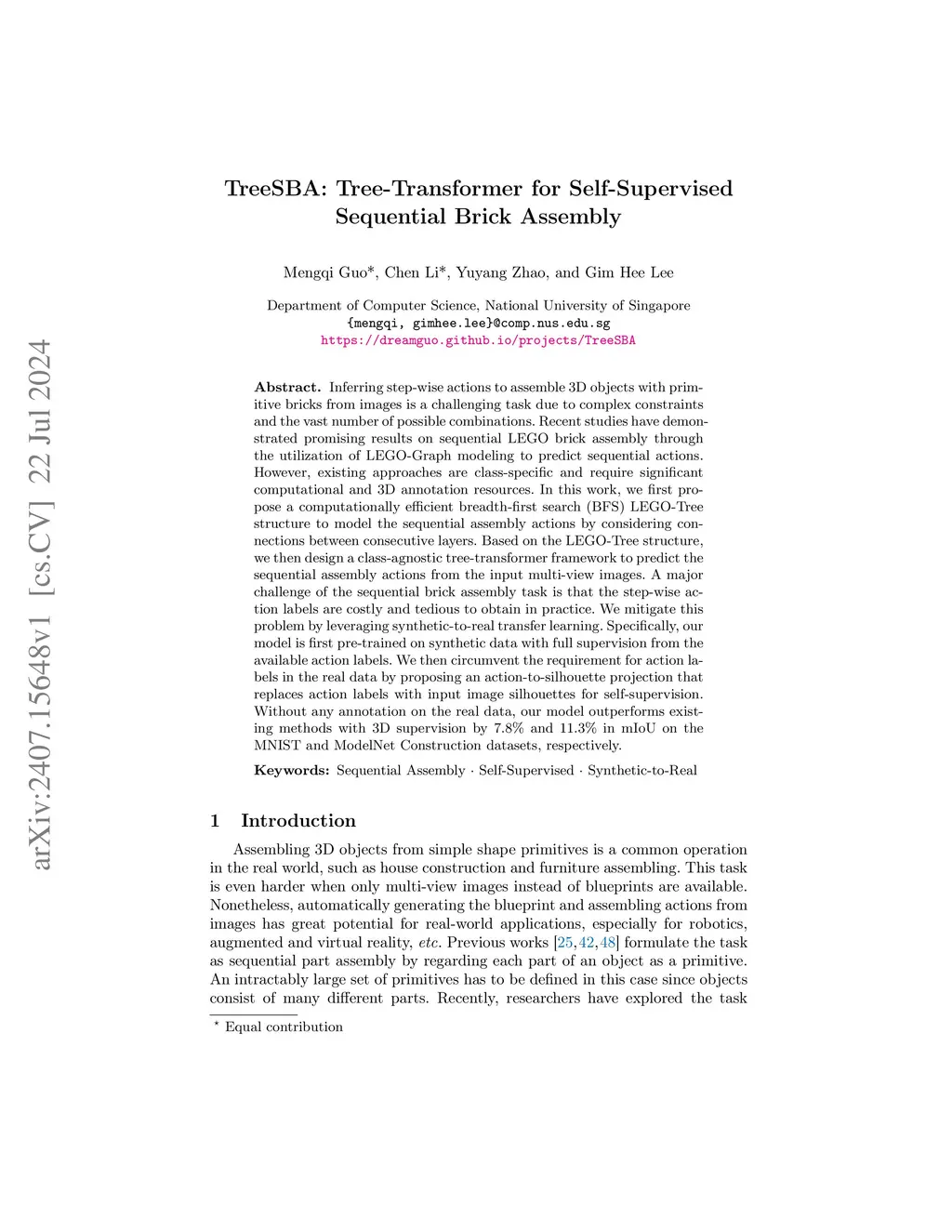 TreeSBA: Tree-Transformer for Self-Supervised Sequential Brick Assembly