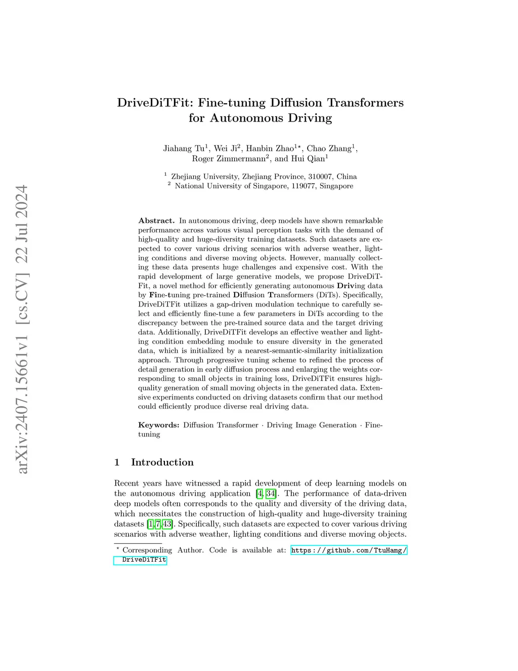 In autonomous driving, deep models have shown remarkable performance across various visual perception tasks with the demand of high-quality and huge-diversity training datasets. Such datasets are expected to cover various driving scenarios with adverse weather, lighting conditions and diverse moving objects. However, manually collecting these data presents huge challenges and expensive cost. With the rapid development of large generative models, we propose DriveDiTFit, a novel method for efficiently generating autonomous Driving data by Fine-tuning pre-trained Diffusion Transformers (DiTs). Specifically, DriveDiTFit utilizes a gap-driven modulation technique to carefully select and efficiently fine-tune a few parameters in DiTs according to the discrepancy between the pre-trained source data and the target driving data. Additionally, DriveDiTFit develops an effective weather and lighting condition embedding module to ensure diversity in the generated data, which is initialized by a nearest-semantic-similarity initialization approach. Through progressive tuning scheme to refined the process of detail generation in early diffusion process and enlarging the weights corresponding to small objects in training loss, DriveDiTFit ensures high-quality generation of small moving objects in the generated data. Extensive experiments conducted on driving datasets confirm that our method could efficiently produce diverse real driving data. The source codes will be available at https://github.com/TtuHamg/DriveDiTFit.