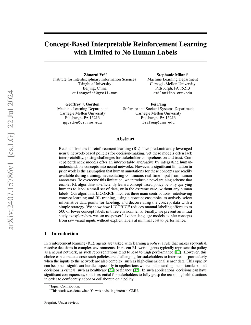 Recent advances in reinforcement learning (RL) have predominantly leveraged neural network-based policies for decision-making, yet these models often lack interpretability, posing challenges for stakeholder comprehension and trust. Concept bottleneck models offer an interpretable alternative by integrating human-understandable concepts into neural networks. However, a significant limitation in prior work is the assumption that human annotations for these concepts are readily available during training, necessitating continuous real-time input from human annotators. To overcome this limitation, we introduce a novel training scheme that enables RL algorithms to efficiently learn a concept-based policy by only querying humans to label a small set of data, or in the extreme case, without any human labels. Our algorithm, LICORICE, involves three main contributions: interleaving concept learning and RL training, using a concept ensembles to actively select informative data points for labeling, and decorrelating the concept data with a simple strategy. We show how LICORICE reduces manual labeling efforts to to 500 or fewer concept labels in three environments. Finally, we present an initial study to explore how we can use powerful vision-language models to infer concepts from raw visual inputs without explicit labels at minimal cost to performance.