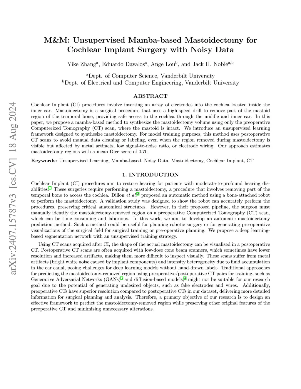 Cochlear Implant (CI) procedures require the insertion of an electrode array into the cochlea within the inner ear. To achieve this, mastoidectomy, a surgical procedure involving the removal of part of the mastoid region of the temporal bone using a high-speed drill provides safe access to the cochlea through the middle and inner ear. In this paper, we propose a novel Mamba-based method to synthesize the mastoidectomy volume using only preoperative Computed Tomography (CT) scans, where the mastoid remains intact. Our approach introduces a self-supervised learning framework designed to predict the mastoidectomy shape and reconstruct a 3D post-mastoidectomy surface directly from preoperative CT scans. This reconstruction aligns with intraoperative microscope views, enabling various downstream surgical applications. For training, we leverage postoperative CT scans to bypass manual data cleaning and labeling, even when the region removed during mastoidectomy is affected by challenges such as metal artifacts, low signal-to-noise ratio, or electrode wiring. Our method achieves a mean Dice score of 0.70 in estimating mastoidectomy regions, demonstrating its effectiveness for accurate and efficient surgical preoperative planning.