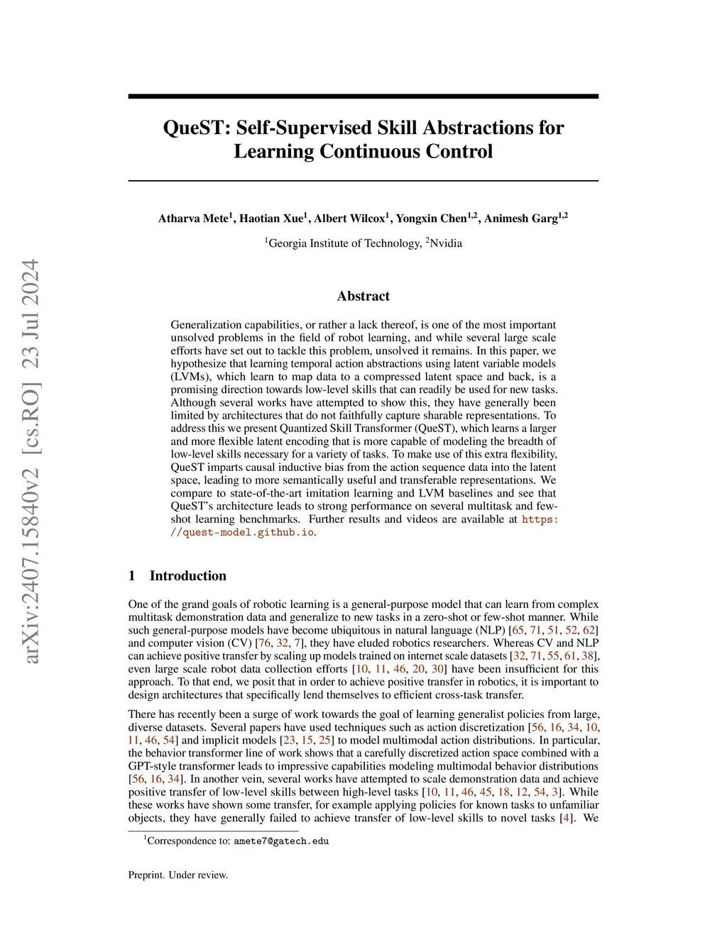 QueST: Self-Supervised Skill Abstractions for Learning Continuous