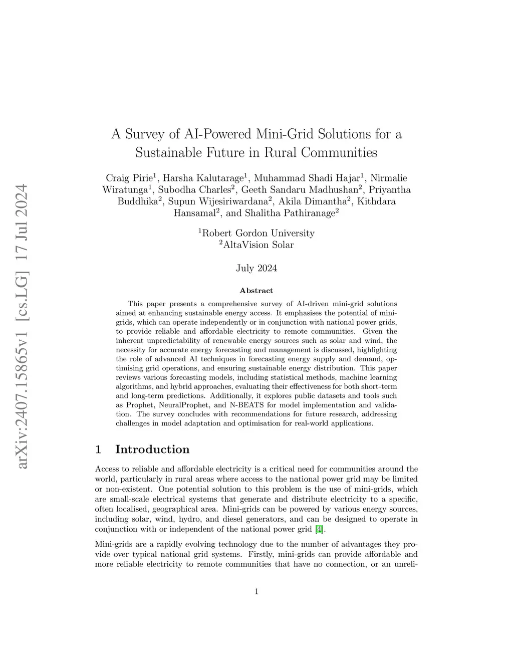 This paper presents a comprehensive survey of AI-driven mini-grid solutions aimed at enhancing sustainable energy access. It emphasises the potential of mini-grids, which can operate independently or in conjunction with national power grids, to provide reliable and affordable electricity to remote communities. Given the inherent unpredictability of renewable energy sources such as solar and wind, the necessity for accurate energy forecasting and management is discussed, highlighting the role of advanced AI techniques in forecasting energy supply and demand, optimising grid operations, and ensuring sustainable energy distribution. This paper reviews various forecasting models, including statistical methods, machine learning algorithms, and hybrid approaches, evaluating their effectiveness for both short-term and long-term predictions. Additionally, it explores public datasets and tools such as Prophet, NeuralProphet, and N-BEATS for model implementation and validation. The survey concludes with recommendations for future research, addressing challenges in model adaptation and optimisation for real-world applications.