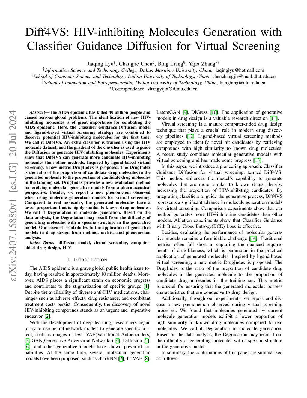 The AIDS epidemic has killed 40 million people and caused serious global problems. The identification of new HIV-inhibiting molecules is of great importance for combating the AIDS epidemic. Here, the Classifier Guidance Diffusion model and ligand-based virtual screening strategy are combined to discover potential HIV-inhibiting molecules for the first time. We call it Diff4VS. An extra classifier is trained using the HIV molecule dataset, and the gradient of the classifier is used to guide the Diffusion to generate HIV-inhibiting molecules. Experiments show that Diff4VS can generate more candidate HIV-inhibiting molecules than other methods. Inspired by ligand-based virtual screening, a new metric DrugIndex is proposed. The DrugIndex is the ratio of the proportion of candidate drug molecules in the generated molecule to the proportion of candidate drug molecules in the training set. DrugIndex provides a new evaluation method for evolving molecular generative models from a pharmaceutical perspective. Besides, we report a new phenomenon observed when using molecule generation models for virtual screening. Compared to real molecules, the generated molecules have a lower proportion that is highly similar to known drug molecules. We call it Degradation in molecule generation. Based on the data analysis, the Degradation may result from the difficulty of generating molecules with a specific structure in the generative model. Our research contributes to the application of generative models in drug design from method, metric, and phenomenon analysis.