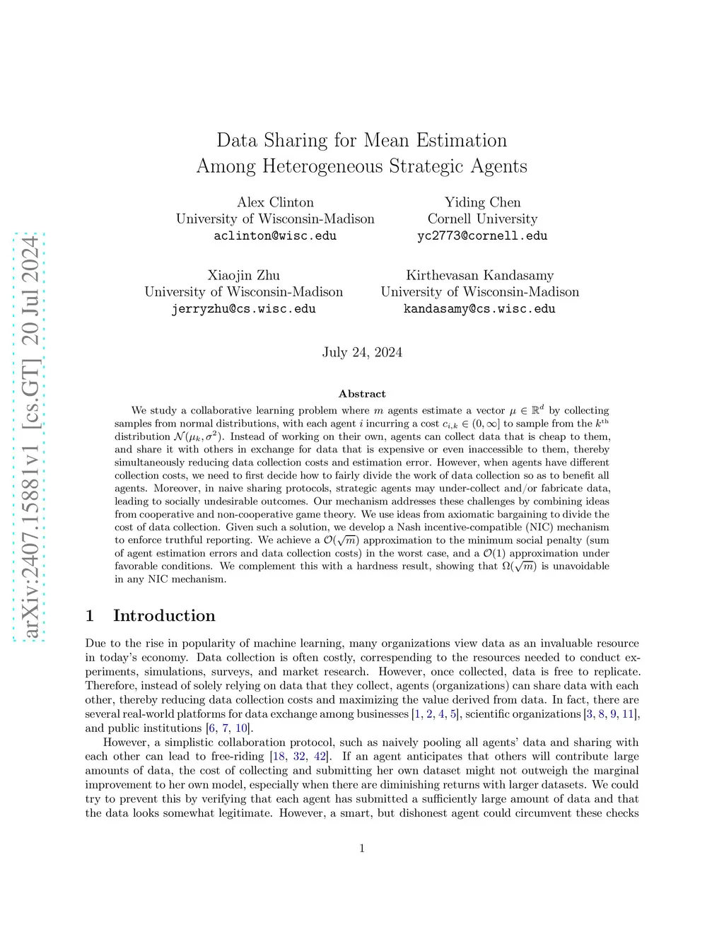 We study a collaborative learning problem where agents aim to estimate a vector by sampling from associated univariate normal distributions . Agent incurs a cost to sample from . Instead of working independently, agents can exchange data, collecting cheaper samples and sharing them in return for costly data, thereby reducing both costs and estimation error. We design a mechanism to facilitate such collaboration, while addressing two key challenges: ensuring individually rational (IR) and fair outcomes so all agents benefit, and preventing strategic behavior (e.g. non-collection, data fabrication) to avoid socially undesirable outcomes. We design a mechanism and an associated Nash equilibrium (NE) which minimizes the social penalty-sum of agents' estimation errors and collection costs-while being IR for all agents. We achieve a -approximation to the minimum social penalty in the worst case and an -approximation under favorable conditions. Additionally, we establish three hardness results: no nontrivial mechanism guarantees (i) a dominant strategy equilibrium where agents report truthfully, (ii) is IR for every strategy profile of other agents, (iii) or avoids a worst-case price of stability in any NE. Finally, by integrating concepts from axiomatic bargaining, we demonstrate that our mechanism supports fairer outcomes than one which minimizes social penalty.