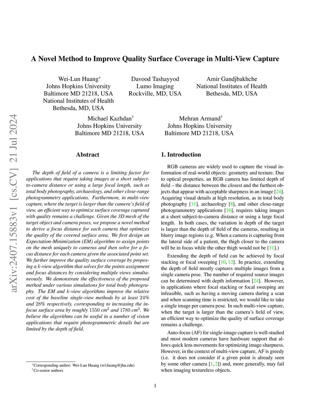 The depth of field of a camera is a limiting factor for applications that require taking images at a short subject-to-camera distance or using a large focal length, such as total body photography, archaeology, and other close-range photogrammetry applications. Furthermore, in multi-view capture, where the target is larger than the camera's field of view, an efficient way to optimize surface coverage captured with quality remains a challenge. Given the 3D mesh of the target object and camera poses, we propose a novel method to derive a focus distance for each camera that optimizes the quality of the covered surface area. We first design an Expectation-Minimization (EM) algorithm to assign points on the mesh uniquely to cameras and then solve for a focus distance for each camera given the associated point set. We further improve the quality surface coverage by proposing a -view algorithm that solves for the points assignment and focus distances by considering multiple views simultaneously. We demonstrate the effectiveness of the proposed method under various simulations for total body photography. The EM and -view algorithms improve the relative cost of the baseline single-view methods by at least % and % respectively, corresponding to increasing the in-focus surface area by roughly cm and cm. We believe the algorithms can be useful in a number of vision applications that require photogrammetric details but are limited by the depth of field.