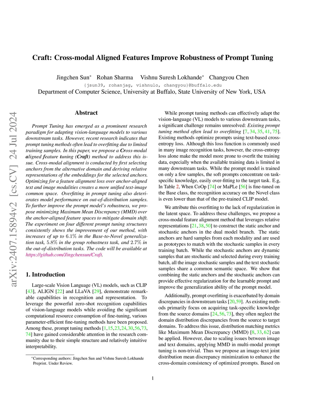 Craft: Cross-modal Aligned Features Improve Robustness of Prompt Tuning