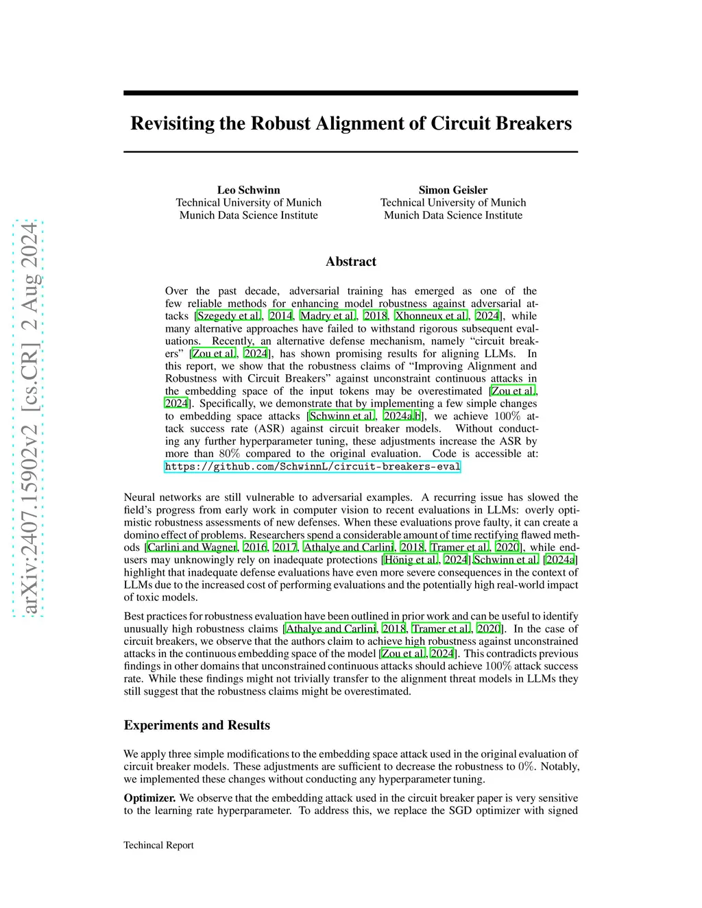 Over the past decade, adversarial training has emerged as one of the few reliable methods for enhancing model robustness against adversarial attacks [Szegedy et al., 2014, Madry et al., 2018, Xhonneux et al., 2024], while many alternative approaches have failed to withstand rigorous subsequent evaluations. Recently, an alternative defense mechanism, namely "circuit breakers" [Zou et al., 2024], has shown promising results for aligning LLMs. In this report, we show that the robustness claims of "Improving Alignment and Robustness with Circuit Breakers" against unconstraint continuous attacks in the embedding space of the input tokens may be overestimated [Zou et al., 2024]. Specifically, we demonstrate that by implementing a few simple changes to embedding space attacks [Schwinn et al., 2024a,b], we achieve 100% attack success rate (ASR) against circuit breaker models. Without conducting any further hyperparameter tuning, these adjustments increase the ASR by more than 80% compared to the original evaluation. Code is accessible at: https://github.com/SchwinnL/circuit-breakers-eval