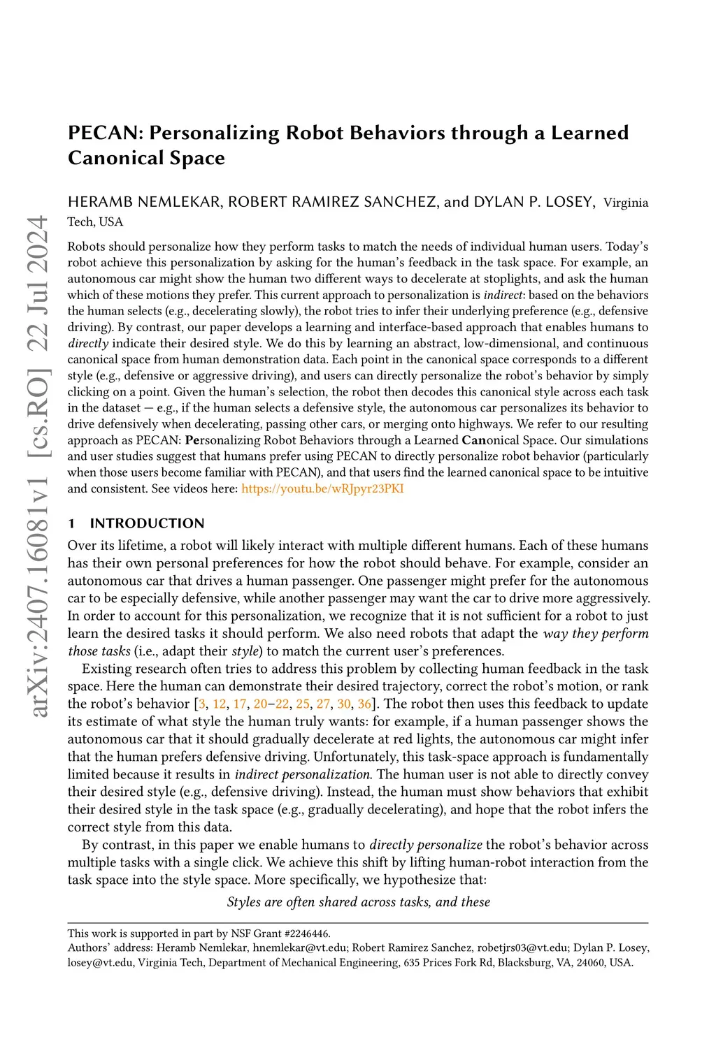 PECAN: Personalizing Robot Behaviors through a Learned Canonical Space