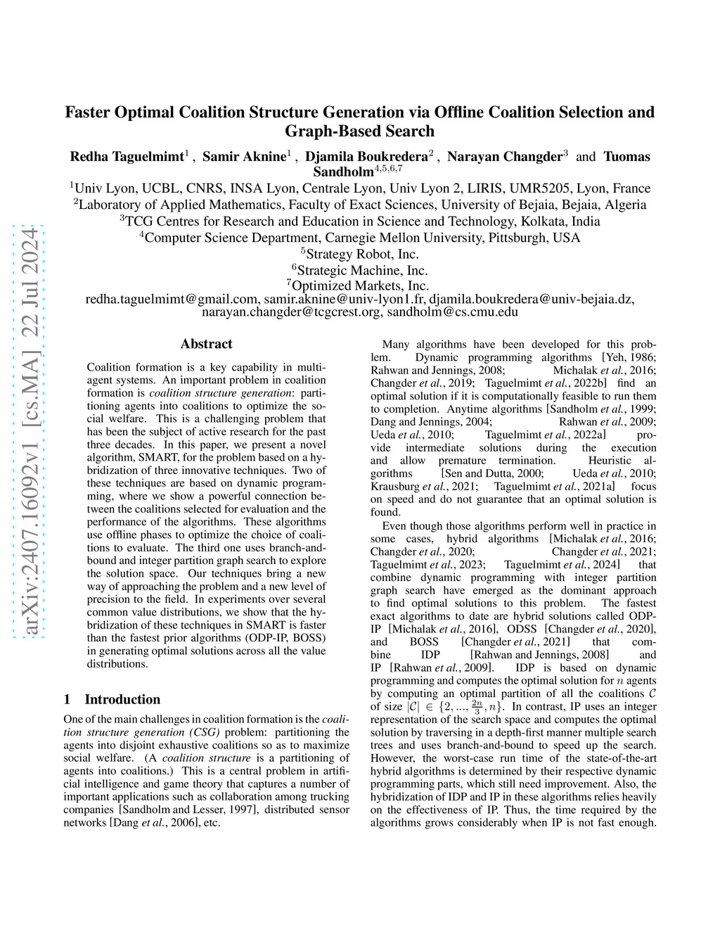Coalition formation is a key capability in multi-agent systems. An important problem in coalition formation is coalition structure generation: partitioning agents into coalitions to optimize the social welfare. This is a challenging problem that has been the subject of active research for the past three decades. In this paper, we present a novel algorithm, SMART, for the problem based on a hybridization of three innovative techniques. Two of these techniques are based on dynamic programming, where we show a powerful connection between the coalitions selected for evaluation and the performance of the algorithms. These algorithms use offline phases to optimize the choice of coalitions to evaluate. The third one uses branch-and-bound and integer partition graph search to explore the solution space. Our techniques bring a new way of approaching the problem and a new level of precision to the field. In experiments over several common value distributions, we show that the hybridization of these techniques in SMART is faster than the fastest prior algorithms (ODP-IP, BOSS) in generating optimal solutions across all the value distributions.