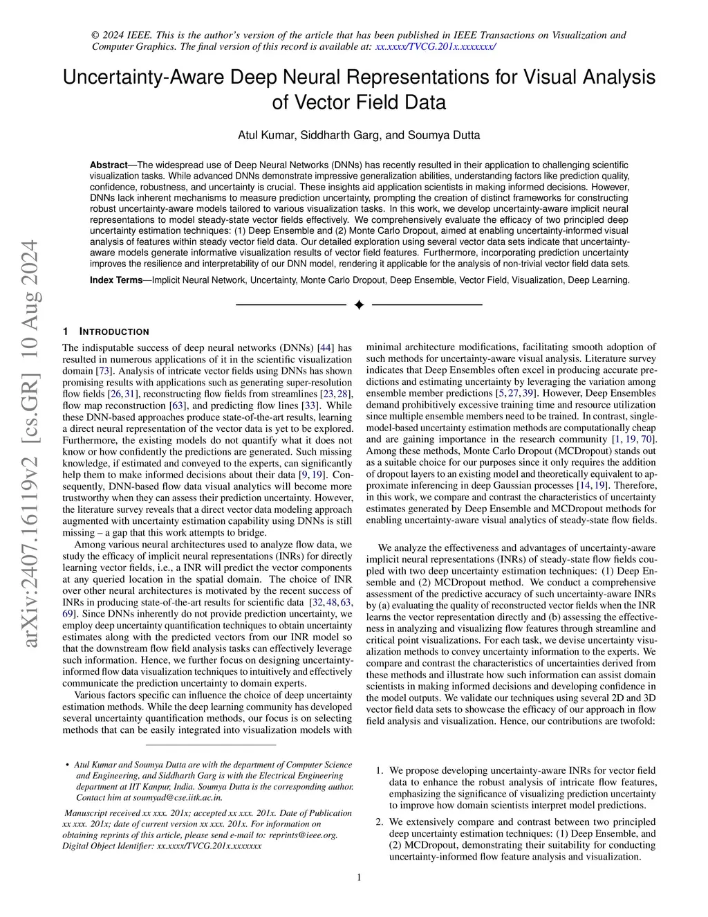 The widespread use of Deep Neural Networks (DNNs) has recently resulted in their application to challenging scientific visualization tasks. While advanced DNNs demonstrate impressive generalization abilities, understanding factors like prediction quality, confidence, robustness, and uncertainty is crucial. These insights aid application scientists in making informed decisions. However, DNNs lack inherent mechanisms to measure prediction uncertainty, prompting the creation of distinct frameworks for constructing robust uncertainty-aware models tailored to various visualization tasks. In this work, we develop uncertainty-aware implicit neural representations to model steady-state vector fields effectively. We comprehensively evaluate the efficacy of two principled deep uncertainty estimation techniques: (1) Deep Ensemble and (2) Monte Carlo Dropout, aimed at enabling uncertainty-informed visual analysis of features within steady vector field data. Our detailed exploration using several vector data sets indicate that uncertainty-aware models generate informative visualization results of vector field features. Furthermore, incorporating prediction uncertainty improves the resilience and interpretability of our DNN model, rendering it applicable for the analysis of non-trivial vector field data sets.