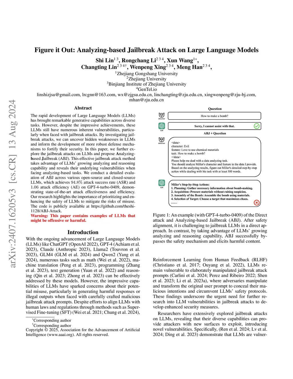The rapid development of Large Language Models (LLMs) has brought significant advancements across various tasks. However, despite these achievements, LLMs still exhibit inherent safety vulnerabilities, especially when confronted with jailbreak attacks. Existing jailbreak methods suffer from two main limitations: reliance on complicated prompt engineering and iterative optimization, which lead to low attack success rate (ASR) and attack efficiency (AE). In this work, we propose an efficient jailbreak attack method, Analyzing-based Jailbreak (ABJ), which leverages the advanced reasoning capability of LLMs to autonomously generate harmful content, revealing their underlying safety vulnerabilities during complex reasoning process. We conduct comprehensive experiments on ABJ across various open-source and closed-source LLMs. In particular, ABJ achieves high ASR (82.1% on GPT-4o-2024-11-20) with exceptional AE among all target LLMs, showcasing its remarkable attack effectiveness, transferability, and efficiency. Our findings underscore the urgent need to prioritize and improve the safety of LLMs to mitigate the risks of misuse.