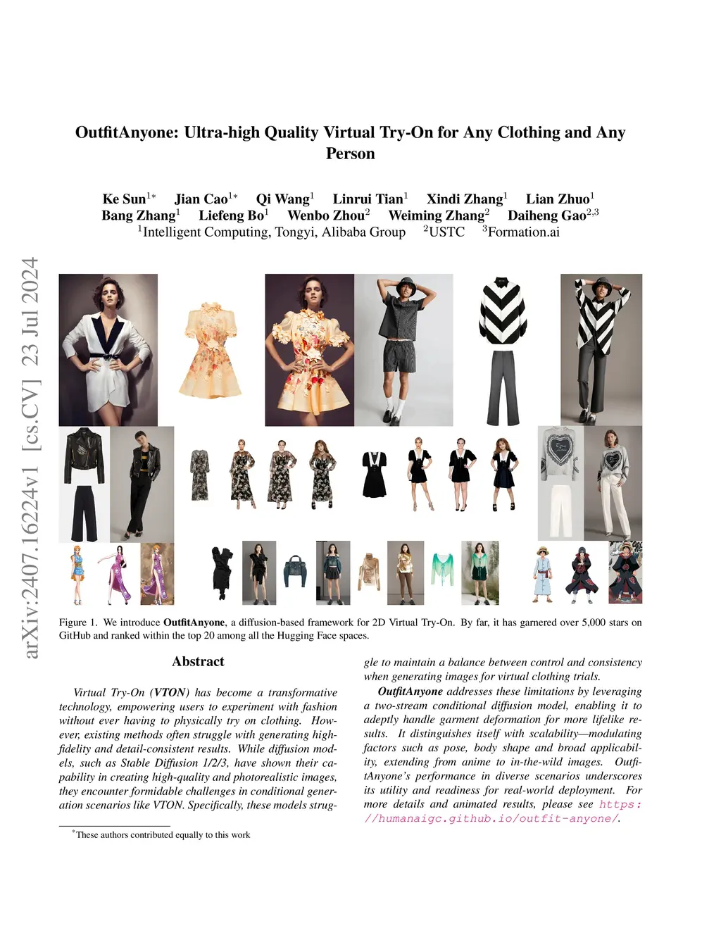 Virtual Try-On (VTON) has become a transformative technology, empowering users to experiment with fashion without ever having to physically try on clothing. However, existing methods often struggle with generating high-fidelity and detail-consistent results. While diffusion models, such as Stable Diffusion series, have shown their capability in creating high-quality and photorealistic images, they encounter formidable challenges in conditional generation scenarios like VTON. Specifically, these models struggle to maintain a balance between control and consistency when generating images for virtual clothing trials. OutfitAnyone addresses these limitations by leveraging a two-stream conditional diffusion model, enabling it to adeptly handle garment deformation for more lifelike results. It distinguishes itself with scalability-modulating factors such as pose, body shape and broad applicability, extending from anime to in-the-wild images. OutfitAnyone's performance in diverse scenarios underscores its utility and readiness for real-world deployment. For more details and animated results, please see \url{https://humanaigc.github.io/outfit-anyone/}.