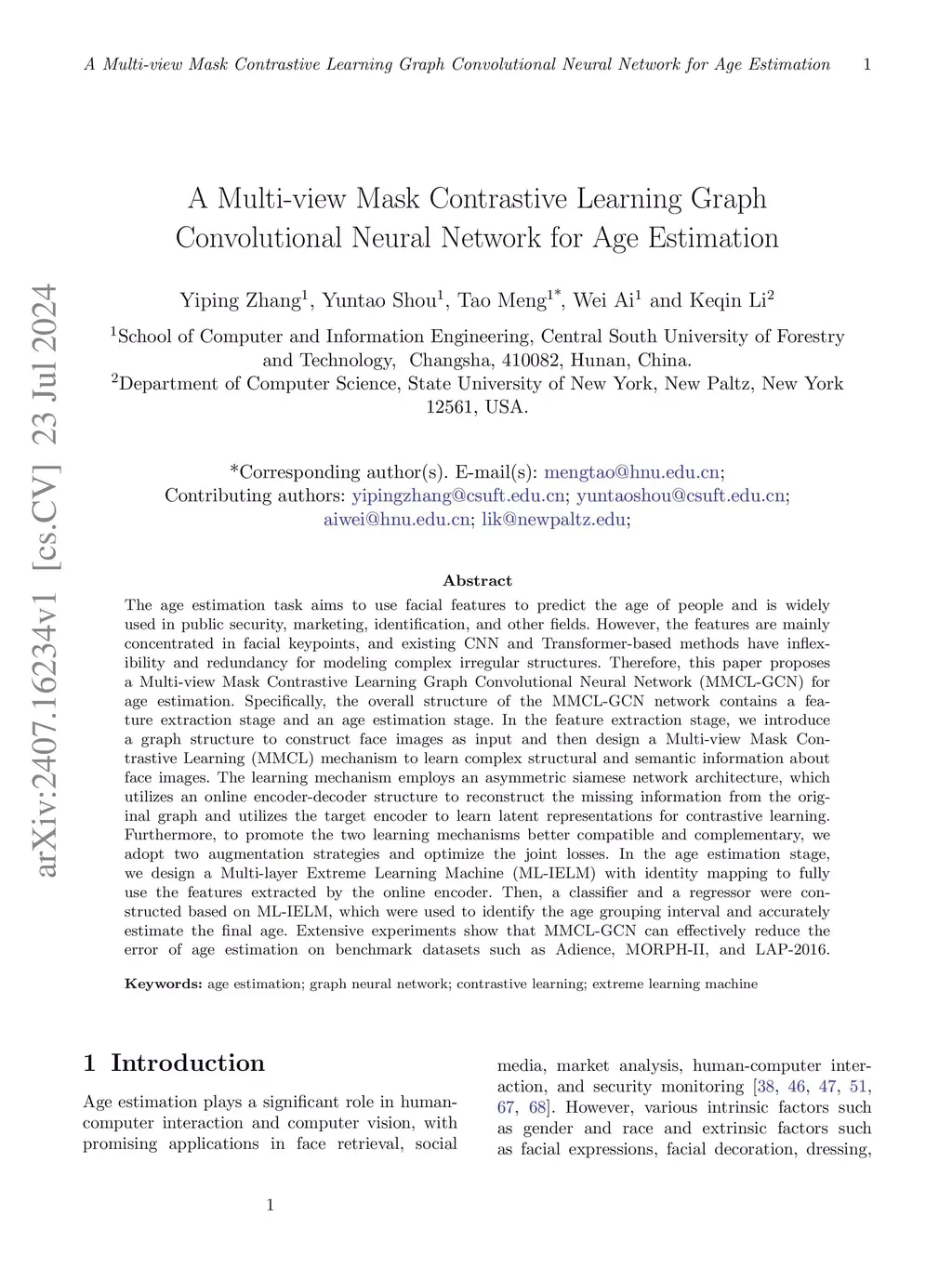 The age estimation task aims to use facial features to predict the age of people and is widely used in public security, marketing, identification, and other fields. However, the features are mainly concentrated in facial keypoints, and existing CNN and Transformer-based methods have inflexibility and redundancy for modeling complex irregular structures. Therefore, this paper proposes a Multi-view Mask Contrastive Learning Graph Convolutional Neural Network (MMCL-GCN) for age estimation. Specifically, the overall structure of the MMCL-GCN network contains a feature extraction stage and an age estimation stage. In the feature extraction stage, we introduce a graph structure to construct face images as input and then design a Multi-view Mask Contrastive Learning (MMCL) mechanism to learn complex structural and semantic information about face images. The learning mechanism employs an asymmetric siamese network architecture, which utilizes an online encoder-decoder structure to reconstruct the missing information from the original graph and utilizes the target encoder to learn latent representations for contrastive learning. Furthermore, to promote the two learning mechanisms better compatible and complementary, we adopt two augmentation strategies and optimize the joint losses. In the age estimation stage, we design a Multi-layer Extreme Learning Machine (ML-IELM) with identity mapping to fully use the features extracted by the online encoder. Then, a classifier and a regressor were constructed based on ML-IELM, which were used to identify the age grouping interval and accurately estimate the final age. Extensive experiments show that MMCL-GCN can effectively reduce the error of age estimation on benchmark datasets such as Adience, MORPH-II, and LAP-2016.