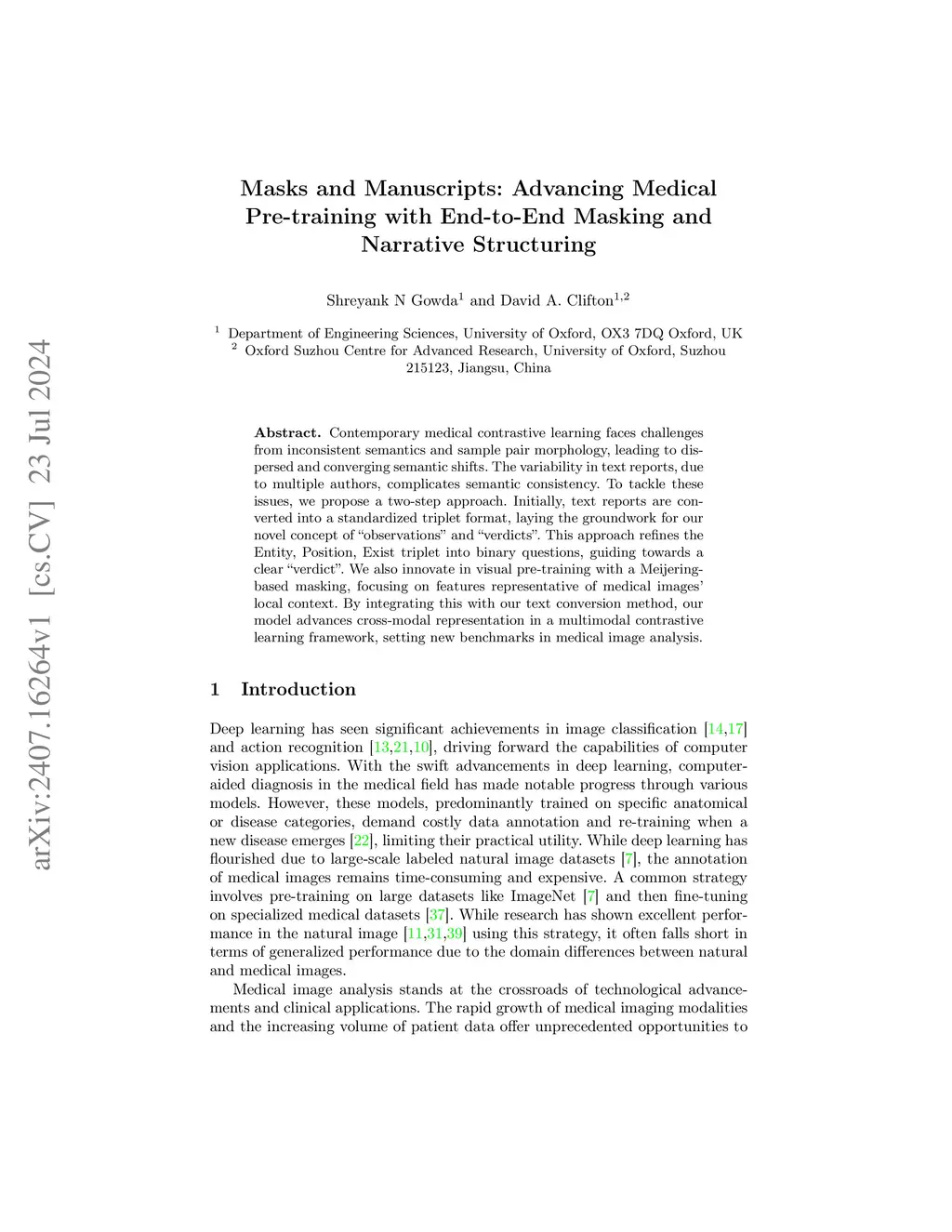 Contemporary medical contrastive learning faces challenges from inconsistent semantics and sample pair morphology, leading to dispersed and converging semantic shifts. The variability in text reports, due to multiple authors, complicates semantic consistency. To tackle these issues, we propose a two-step approach. Initially, text reports are converted into a standardized triplet format, laying the groundwork for our novel concept of ``observations'' and ``verdicts''. This approach refines the {Entity, Position, Exist} triplet into binary questions, guiding towards a clear ``verdict''. We also innovate in visual pre-training with a Meijering-based masking, focusing on features representative of medical images' local context. By integrating this with our text conversion method, our model advances cross-modal representation in a multimodal contrastive learning framework, setting new benchmarks in medical image analysis.