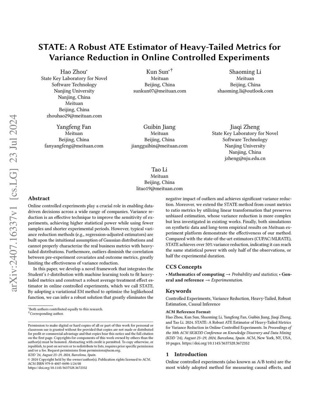 Online controlled experiments play a crucial role in enabling data-driven decisions across a wide range of companies. Variance reduction is an effective technique to improve the sensitivity of experiments, achieving higher statistical power while using fewer samples and shorter experimental periods. However, typical variance reduction methods (e.g., regression-adjusted estimators) are built upon the intuitional assumption of Gaussian distributions and cannot properly characterize the real business metrics with heavy-tailed distributions. Furthermore, outliers diminish the correlation between pre-experiment covariates and outcome metrics, greatly limiting the effectiveness of variance reduction. In this paper, we develop a novel framework that integrates the Student's t-distribution with machine learning tools to fit heavy-tailed metrics and construct a robust average treatment effect estimator in online controlled experiments, which we call STATE. By adopting a variational EM method to optimize the loglikehood function, we can infer a robust solution that greatly eliminates the negative impact of outliers and achieves significant variance reduction. Moreover, we extend the STATE method from count metrics to ratio metrics by utilizing linear transformation that preserves unbiased estimation, whose variance reduction is more complex but less investigated in existing works. Finally, both simulations on synthetic data and long-term empirical results on Meituan experiment platform demonstrate the effectiveness of our method. Compared with the state-of-the-art estimators (CUPAC/MLRATE), STATE achieves over 50% variance reduction, indicating it can reach the same statistical power with only half of the observations, or half the experimental duration.