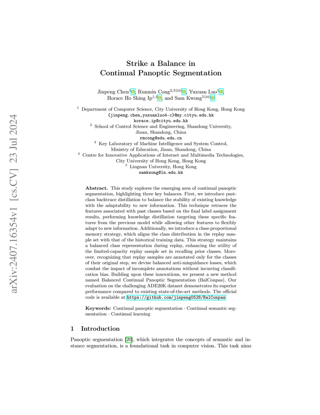 This study explores the emerging area of continual panoptic segmentation, highlighting three key balances. First, we introduce past-class backtrace distillation to balance the stability of existing knowledge with the adaptability to new information. This technique retraces the features associated with past classes based on the final label assignment results, performing knowledge distillation targeting these specific features from the previous model while allowing other features to flexibly adapt to new information. Additionally, we introduce a class-proportional memory strategy, which aligns the class distribution in the replay sample set with that of the historical training data. This strategy maintains a balanced class representation during replay, enhancing the utility of the limited-capacity replay sample set in recalling prior classes. Moreover, recognizing that replay samples are annotated only for the classes of their original step, we devise balanced anti-misguidance losses, which combat the impact of incomplete annotations without incurring classification bias. Building upon these innovations, we present a new method named Balanced Continual Panoptic Segmentation (BalConpas). Our evaluation on the challenging ADE20K dataset demonstrates its superior performance compared to existing state-of-the-art methods. The official code is available at https://github.com/jinpeng0528/BalConpas.