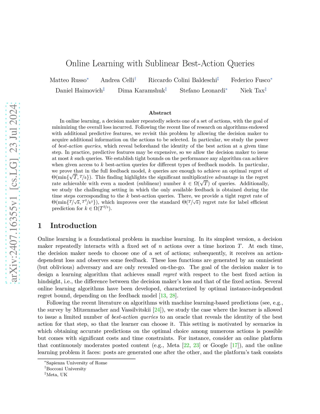In online learning, a decision maker repeatedly selects one of a set of actions, with the goal of minimizing the overall loss incurred. Following the recent line of research on algorithms endowed with additional predictive features, we revisit this problem by allowing the decision maker to acquire additional information on the actions to be selected. In particular, we study the power of \emph{best-action queries}, which reveal beforehand the identity of the best action at a given time step. In practice, predictive features may be expensive, so we allow the decision maker to issue at most such queries. We establish tight bounds on the performance any algorithm can achieve when given access to best-action queries for different types of feedback models. In particular, we prove that in the full feedback model, queries are enough to achieve an optimal regret of . This finding highlights the significant multiplicative advantage in the regret rate achievable with even a modest (sublinear) number of queries. Additionally, we study the challenging setting in which the only available feedback is obtained during the time steps corresponding to the best-action queries. There, we provide a tight regret rate of , which improves over the standard regret rate for label efficient prediction for .