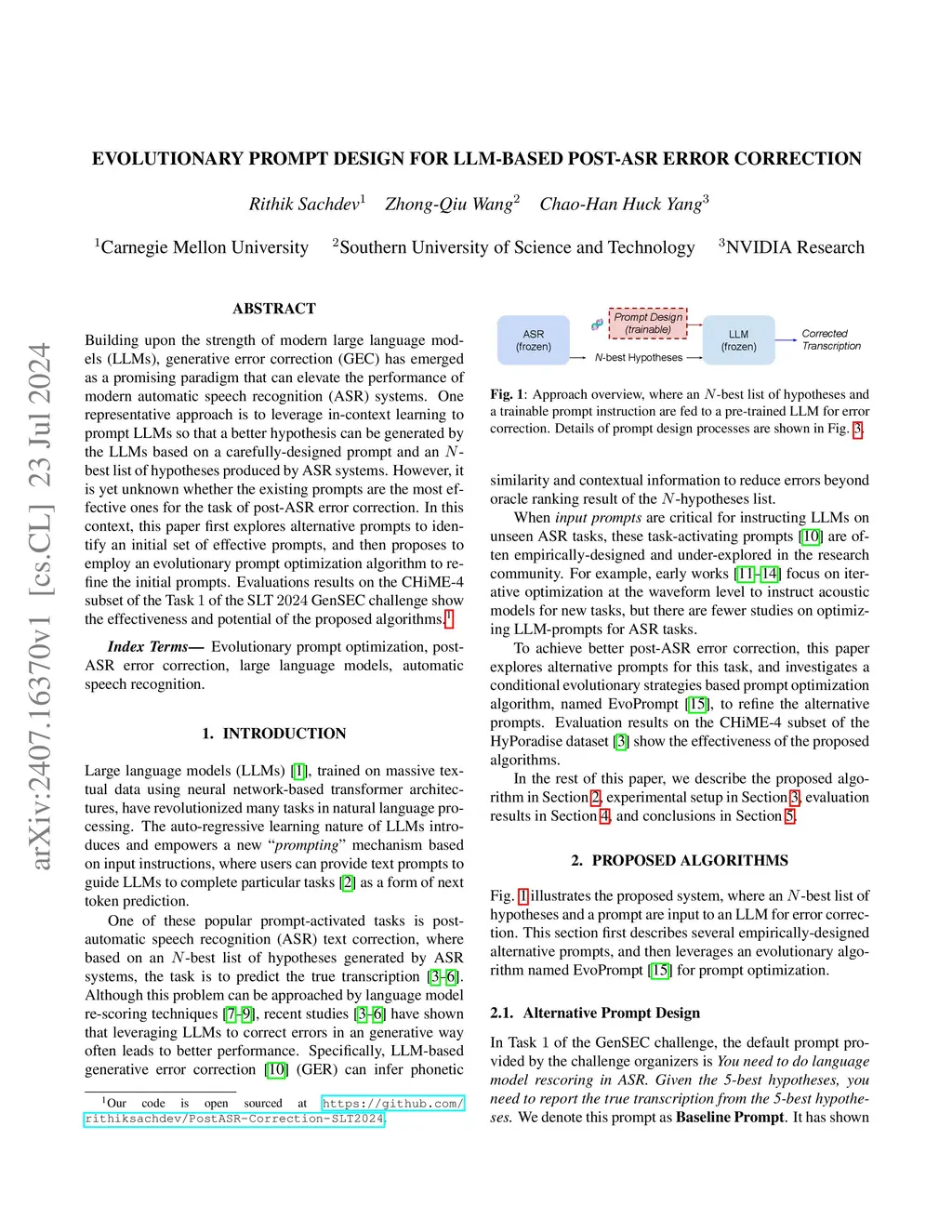 Building upon the strength of modern large language models (LLMs), generative error correction (GEC) has emerged as a promising paradigm that can elevate the performance of modern automatic speech recognition (ASR) systems. One representative approach is to leverage in-context learning to prompt LLMs so that a better hypothesis can be generated by the LLMs based on a carefully-designed prompt and an -best list of hypotheses produced by ASR systems. However, it is yet unknown whether the existing prompts are the most effective ones for the task of post-ASR error correction. In this context, this paper first explores alternative prompts to identify an initial set of effective prompts, and then proposes to employ an evolutionary prompt optimization algorithm to refine the initial prompts. Evaluations results on the CHiME-4 subset of the Task of the SLT GenSEC challenge show the effectiveness and potential of the proposed algorithms.
