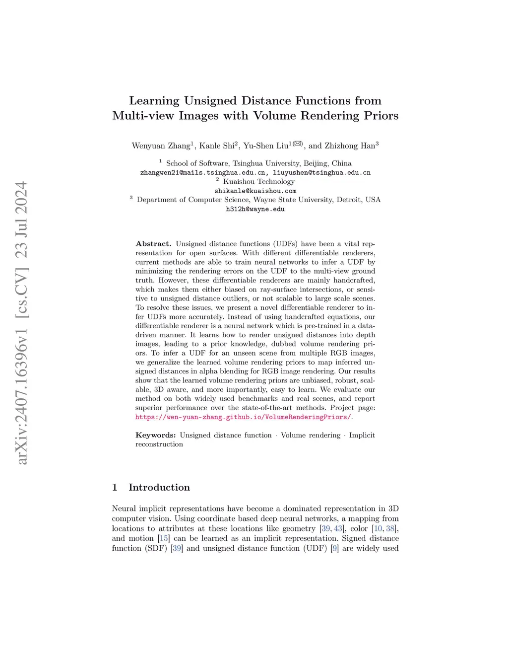 Unsigned distance functions (UDFs) have been a vital representation for open surfaces. With different differentiable renderers, current methods are able to train neural networks to infer a UDF by minimizing the rendering errors with the UDF to the multi-view ground truth. However, these differentiable renderers are mainly handcrafted, which makes them either biased on ray-surface intersections, or sensitive to unsigned distance outliers, or not scalable to large scenes. To resolve these issues, we present a novel differentiable renderer to infer UDFs more accurately. Instead of using handcrafted equations, our differentiable renderer is a neural network which is pre-trained in a data-driven manner. It learns how to render unsigned distances into depth images, leading to a prior knowledge, dubbed volume rendering priors. To infer a UDF for an unseen scene from multiple RGB images, we generalize the learned volume rendering priors to map inferred unsigned distances in alpha blending for RGB image rendering. To reduce the bias of sampling in UDF inference, we utilize an auxiliary point sampling prior as an indicator of ray-surface intersection, and propose novel schemes towards more accurate and uniform sampling near the zero-level sets. We also propose a new strategy that leverages our pretrained volume rendering prior to serve as a general surface refiner, which can be integrated with various Gaussian reconstruction methods to optimize the Gaussian distributions and refine geometric details. Our results show that the learned volume rendering prior is unbiased, robust, scalable, 3D aware, and more importantly, easy to learn. Further experiments show that the volume rendering prior is also a general strategy to enhance other neural implicit representations such as signed distance function and occupancy.