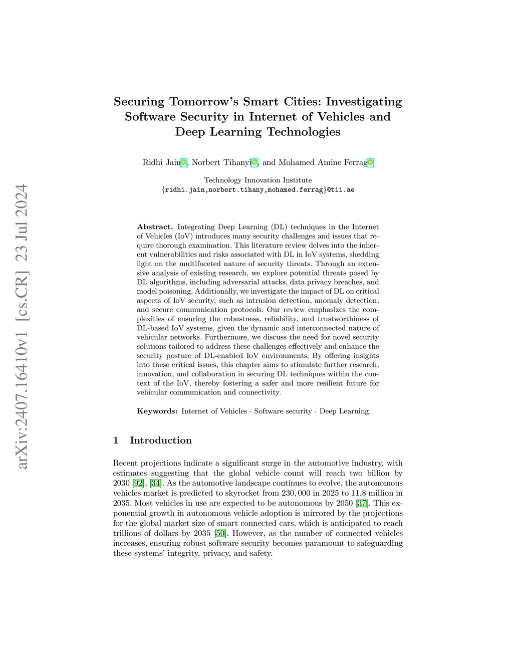 Integrating Deep Learning (DL) techniques in the Internet of Vehicles (IoV) introduces many security challenges and issues that require thorough examination. This literature review delves into the inherent vulnerabilities and risks associated with DL in IoV systems, shedding light on the multifaceted nature of security threats. Through an extensive analysis of existing research, we explore potential threats posed by DL algorithms, including adversarial attacks, data privacy breaches, and model poisoning. Additionally, we investigate the impact of DL on critical aspects of IoV security, such as intrusion detection, anomaly detection, and secure communication protocols. Our review emphasizes the complexities of ensuring the robustness, reliability, and trustworthiness of DL-based IoV systems, given the dynamic and interconnected nature of vehicular networks. Furthermore, we discuss the need for novel security solutions tailored to address these challenges effectively and enhance the security posture of DL-enabled IoV environments. By offering insights into these critical issues, this chapter aims to stimulate further research, innovation, and collaboration in securing DL techniques within the context of the IoV, thereby fostering a safer and more resilient future for vehicular communication and connectivity.