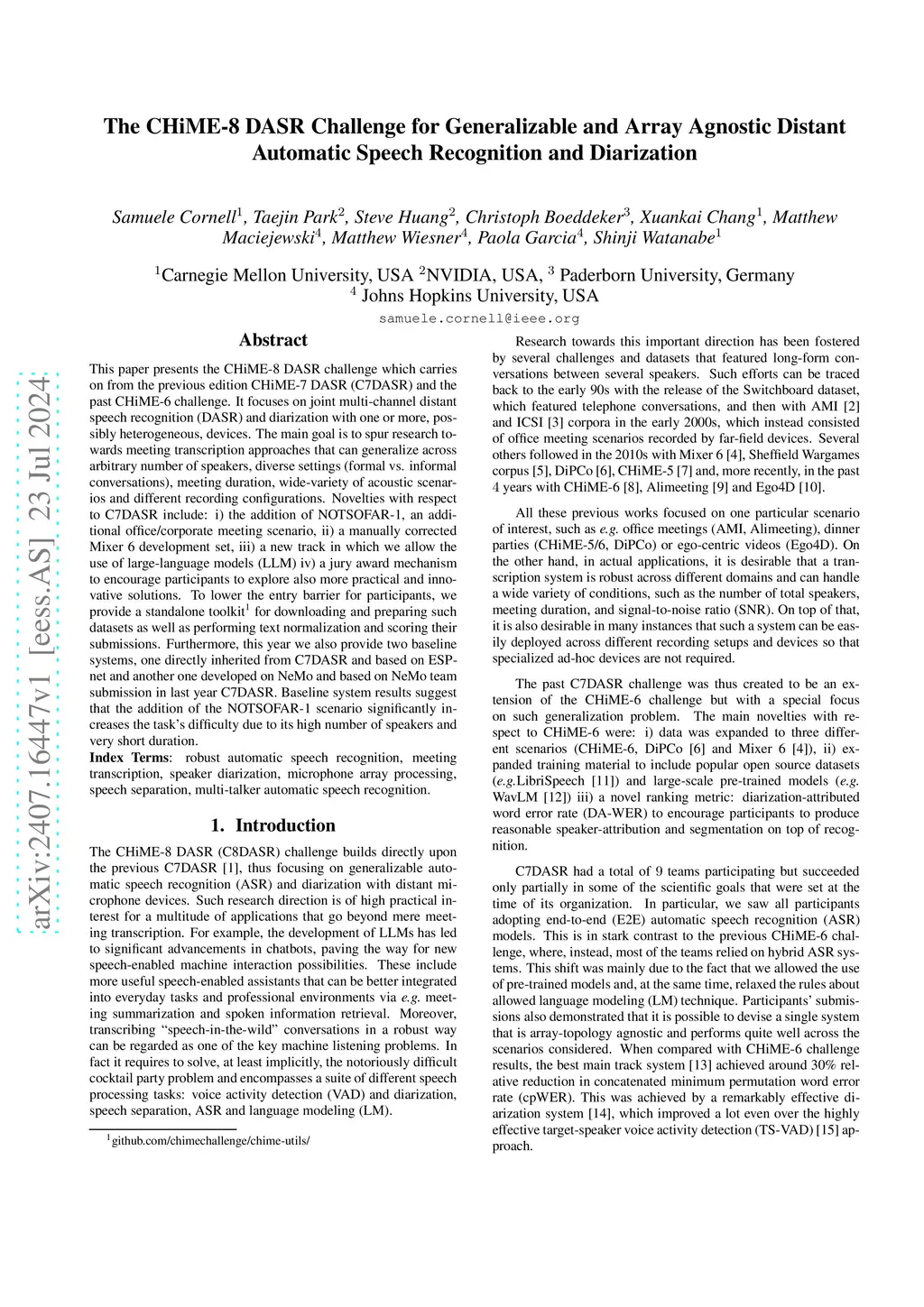 This paper presents the CHiME-8 DASR challenge which carries on from the previous edition CHiME-7 DASR (C7DASR) and the past CHiME-6 challenge. It focuses on joint multi-channel distant speech recognition (DASR) and diarization with one or more, possibly heterogeneous, devices. The main goal is to spur research towards meeting transcription approaches that can generalize across arbitrary number of speakers, diverse settings (formal vs. informal conversations), meeting duration, wide-variety of acoustic scenarios and different recording configurations. Novelties with respect to C7DASR include: i) the addition of NOTSOFAR-1, an additional office/corporate meeting scenario, ii) a manually corrected Mixer 6 development set, iii) a new track in which we allow the use of large-language models (LLM) iv) a jury award mechanism to encourage participants to explore also more practical and innovative solutions. To lower the entry barrier for participants, we provide a standalone toolkit for downloading and preparing such datasets as well as performing text normalization and scoring their submissions. Furthermore, this year we also provide two baseline systems, one directly inherited from C7DASR and based on ESPnet and another one developed on NeMo and based on NeMo team submission in last year C7DASR. Baseline system results suggest that the addition of the NOTSOFAR-1 scenario significantly increases the task's difficulty due to its high number of speakers and very short duration.