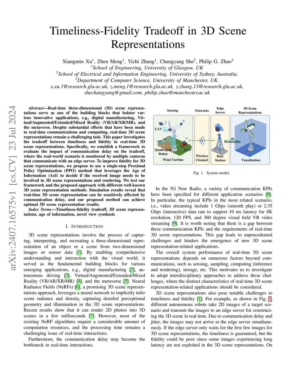 Real-time three-dimensional (3D) scene representations serve as one of the building blocks that bolster various innovative applications, e.g., digital manufacturing, Virtual/Augmented/Extended/Mixed Reality (VR/AR/XR/MR), and the metaverse. Despite substantial efforts that have been made to real-time communications and computing, real-time 3D scene representations remain a challenging task. This paper investigates the tradeoff between timeliness and fidelity in real-time 3D scene representations. Specifically, we establish a framework to evaluate the impact of communication delay on the tradeoff, where the real-world scenario is monitored by multiple cameras that communicate with an edge server. To improve fidelity for 3D scene representations, we propose to use a single-step Proximal Policy Optimization (PPO) method that leverages the Age of Information (AoI) to decide if the received image needs to be involved in 3D scene representations and rendering. We test our framework and the proposed approach with different well-known 3D scene representation methods. Simulation results reveal that real-time 3D scene representation can be sensitively affected by communication delay, and our proposed method can achieve optimal 3D scene representation results.