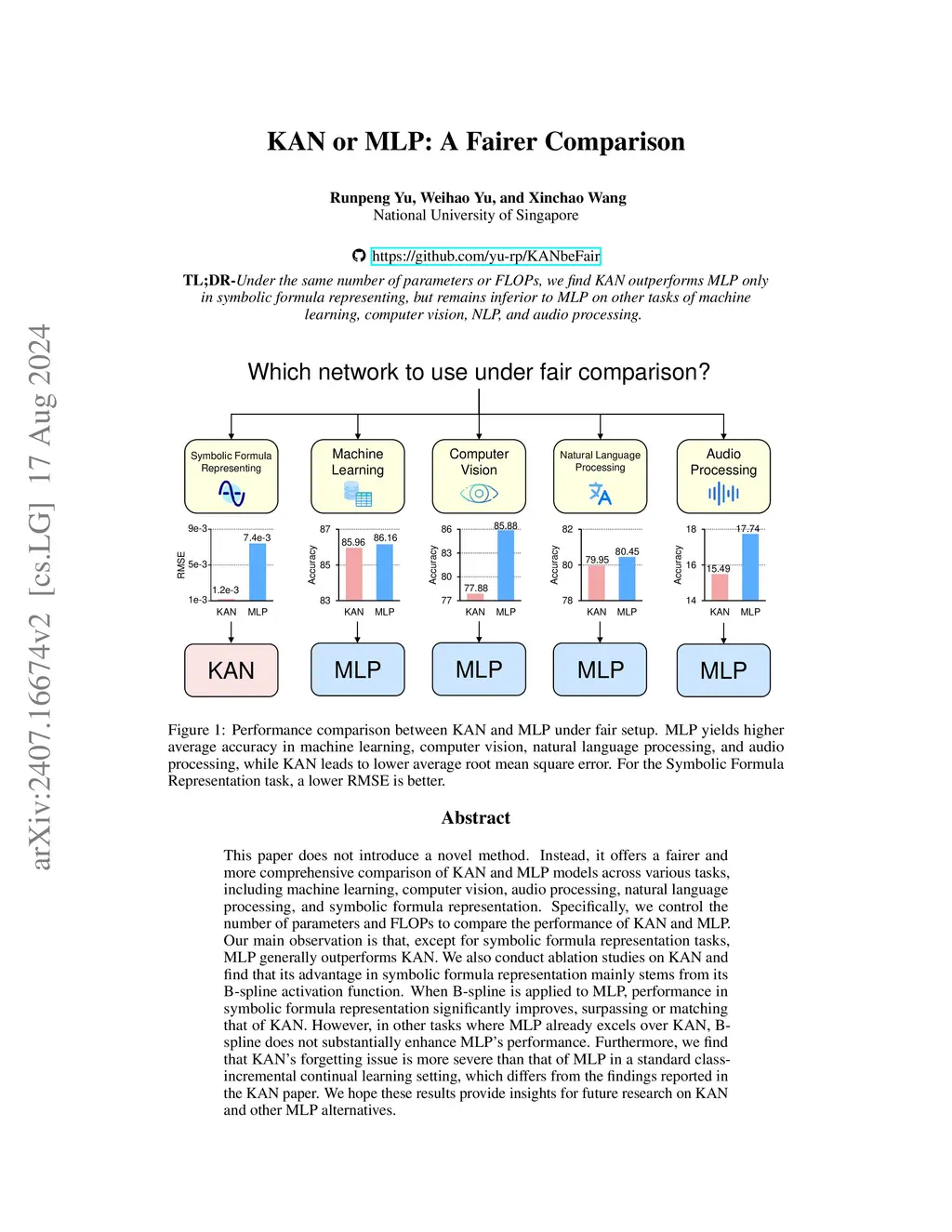 KAN or MLP: A Fairer Comparison