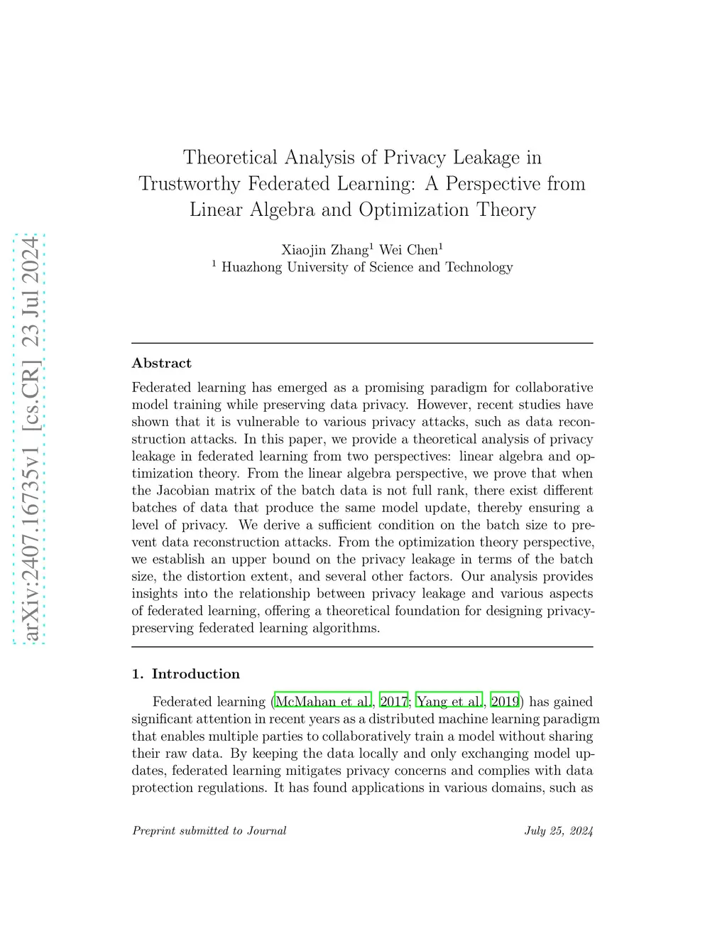Federated learning has emerged as a promising paradigm for collaborative model training while preserving data privacy. However, recent studies have shown that it is vulnerable to various privacy attacks, such as data reconstruction attacks. In this paper, we provide a theoretical analysis of privacy leakage in federated learning from two perspectives: linear algebra and optimization theory. From the linear algebra perspective, we prove that when the Jacobian matrix of the batch data is not full rank, there exist different batches of data that produce the same model update, thereby ensuring a level of privacy. We derive a sufficient condition on the batch size to prevent data reconstruction attacks. From the optimization theory perspective, we establish an upper bound on the privacy leakage in terms of the batch size, the distortion extent, and several other factors. Our analysis provides insights into the relationship between privacy leakage and various aspects of federated learning, offering a theoretical foundation for designing privacy-preserving federated learning algorithms.